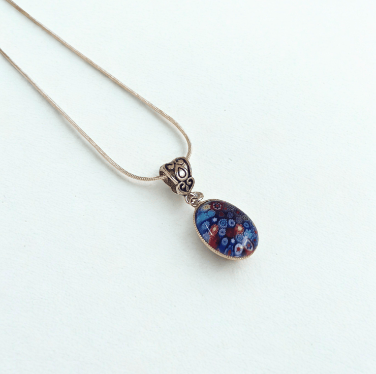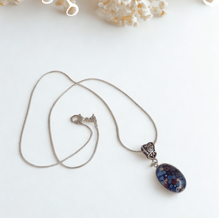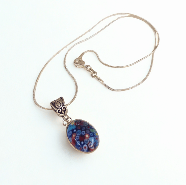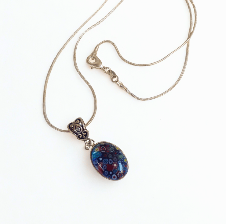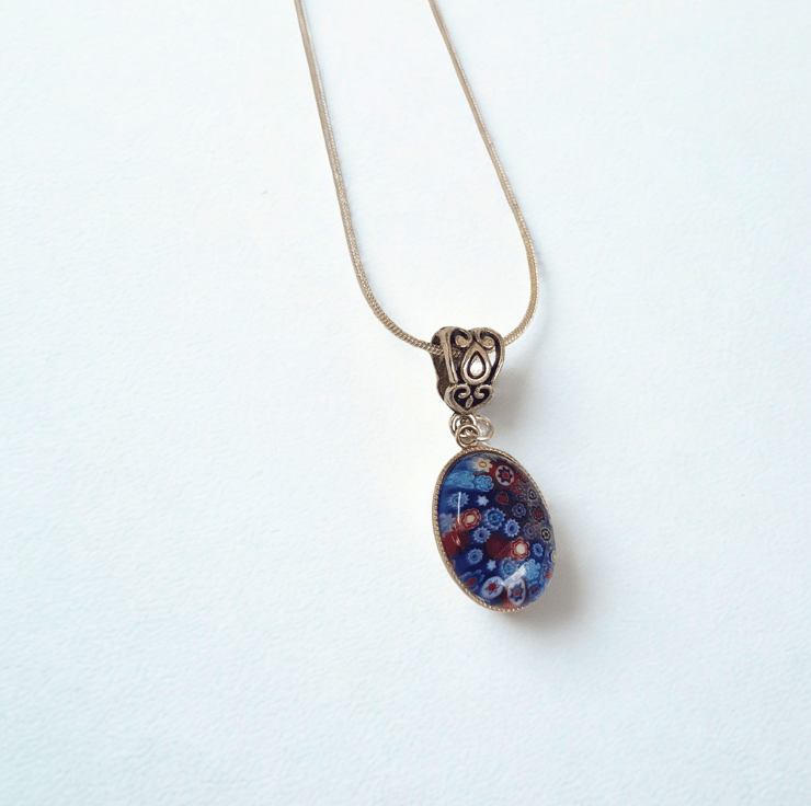 A deep blue Murano glass oval pendant in a silver setting. Handing on a 925 silver snake style chain with a lobster catch. The chain is 18 inches in length. Please indicate when you order if would prefer a 16" or 20" chain instead.