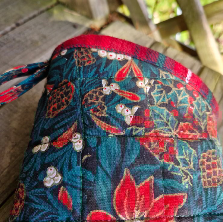 The outer layer is made of a Christmas poinsettia cotton fabric, which also has berries and fir cones on it.