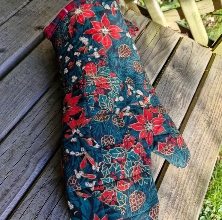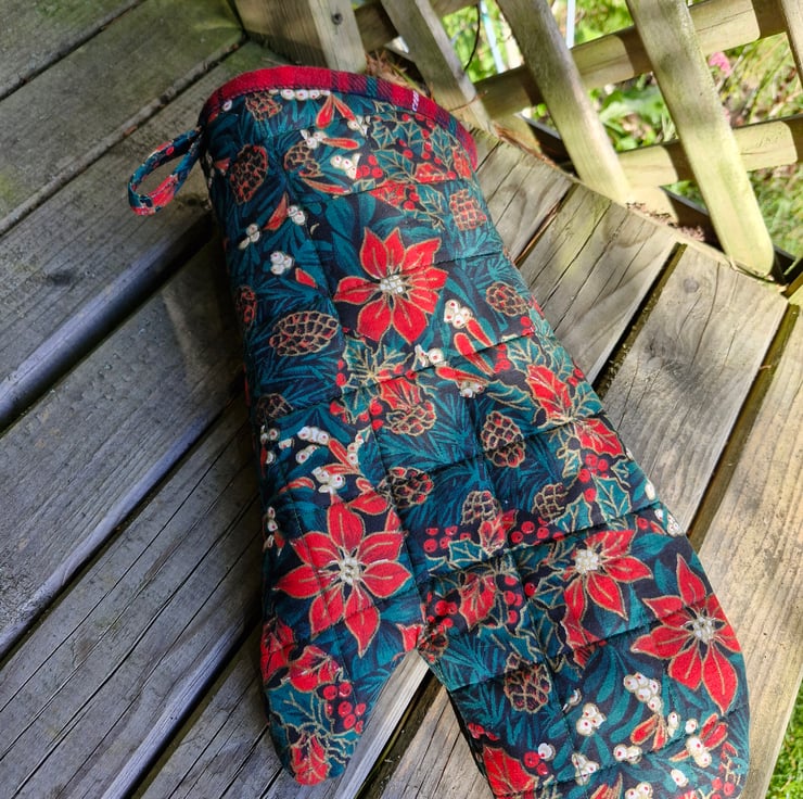 This lovely oven glove has been made using an insulating, heat resistant wadding. There is also an additional layer of fabric quilted inside to make the glove thicker.