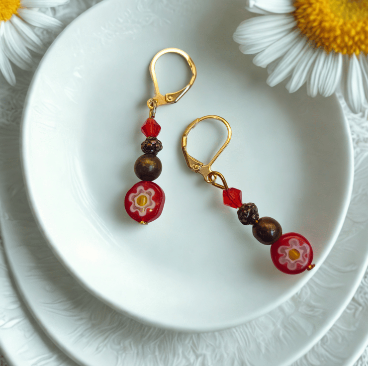 Red Millefiori glass beads with a daisy design combined with Tibetan silver, red glass crystal and antique gold beads. Hanging on gold plated lever back hooks.