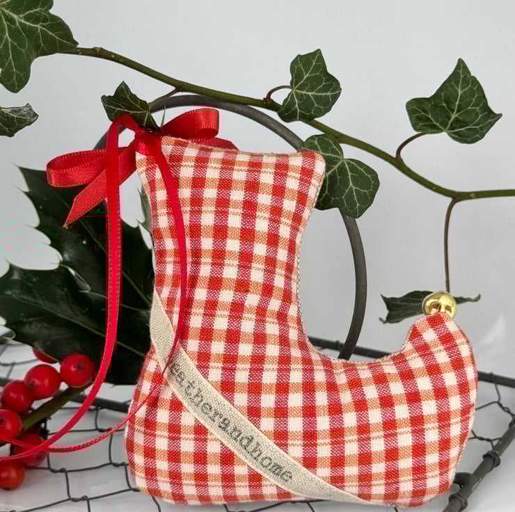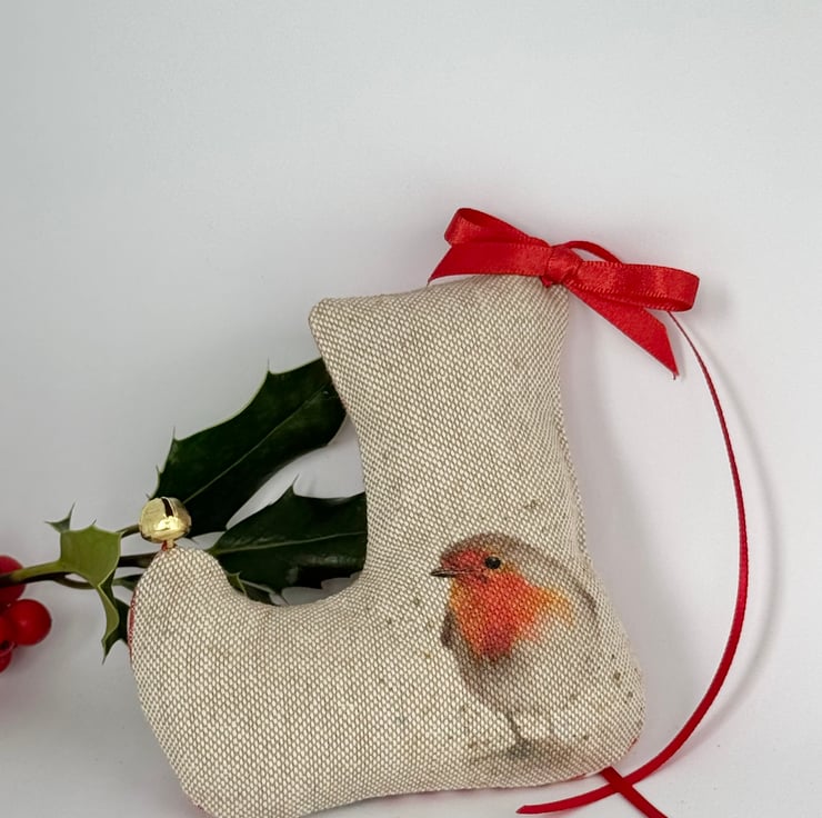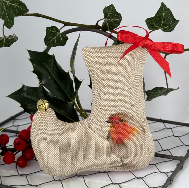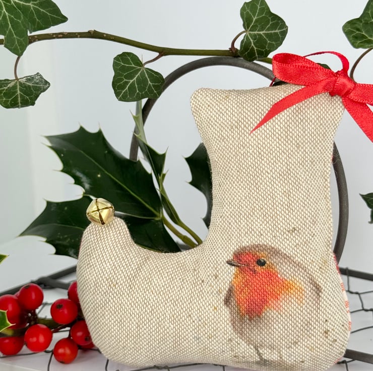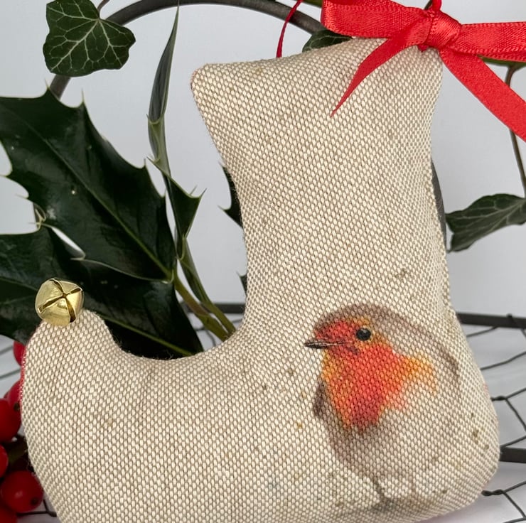 If it's Christmas, it must be robins! And an inquisitive little robin appears here on a stocking decoration with a cheeky upturned toe, topped with a shiny gold jingle bell. The reverse side is a jolly tangerine-red check, and the stocking is finished with red satin ribbon hanging ties and bow. Filled with hypoallergenic wool toy-stuffing and whole cloves for an enticingly spicy Christmas aroma.