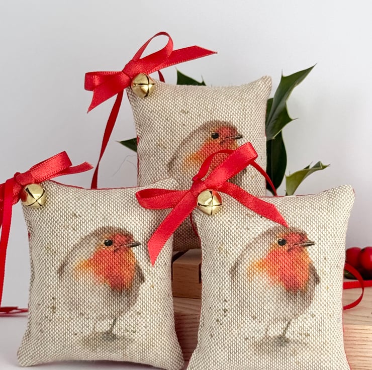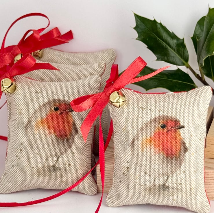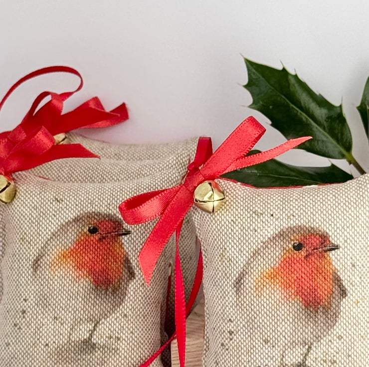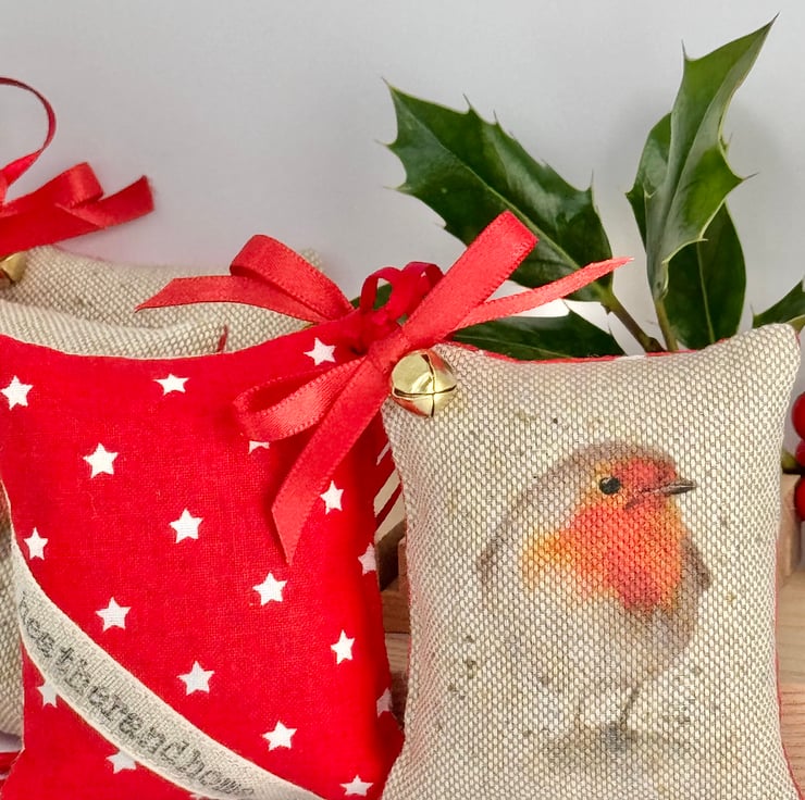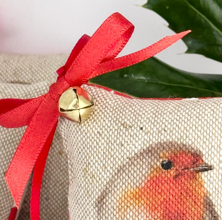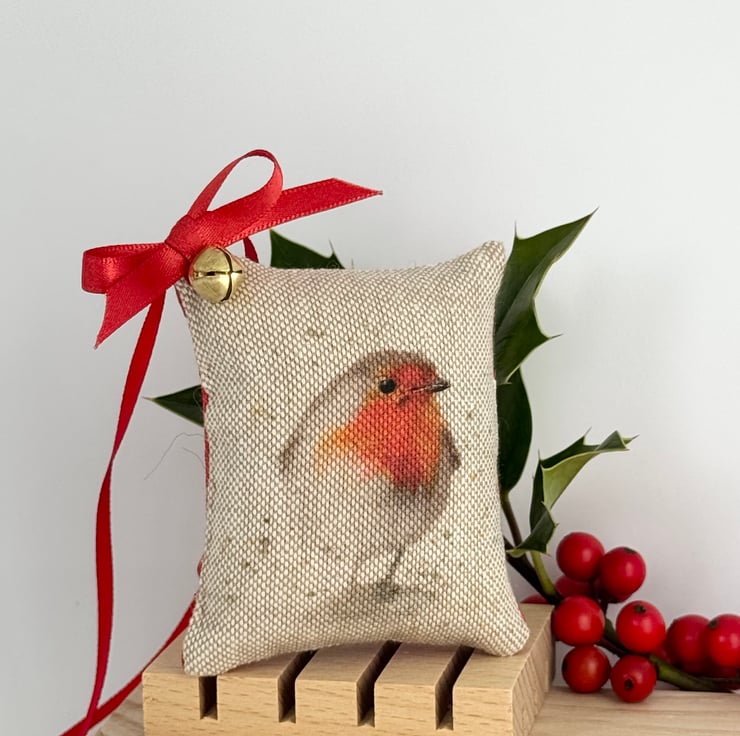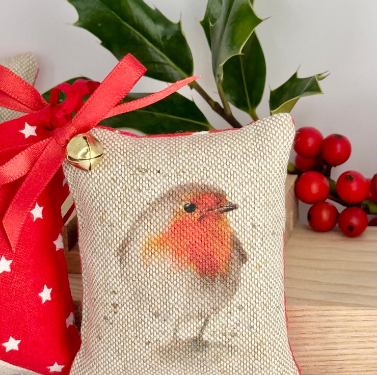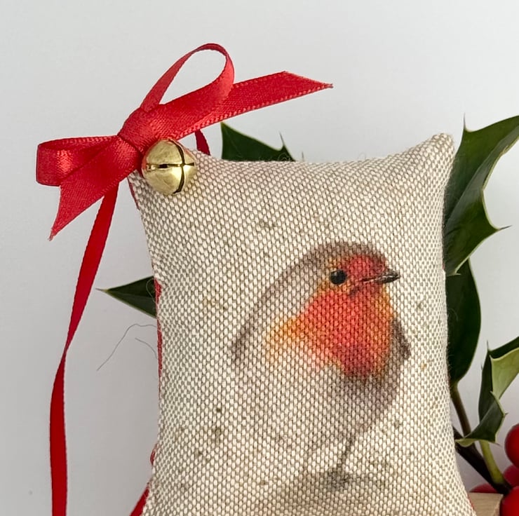 A charming Christmas decoration featuring a winsomely inquisitive robin on the front, his/her redbreast resplendent against the linen-look ecru background, and with a festive star-printed fabric reverse side. Beautifully finished with a shiny gold jingle bell, red satin ribbon hanging ties and bow. And generously filled with toy-grade wool toy-stuffing and whole cloves for a warm and spicy Christmas aroma.
