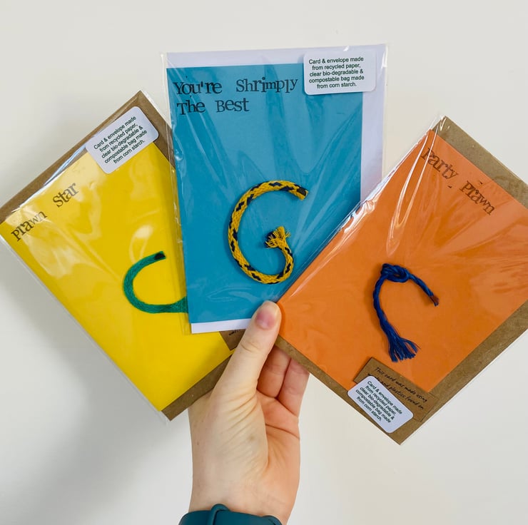 A pack of 3 handmade cards made from fishing waste and a plant pot - all found washed up on local beaches.