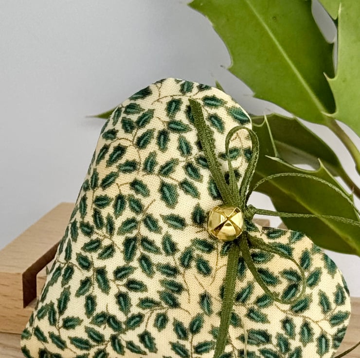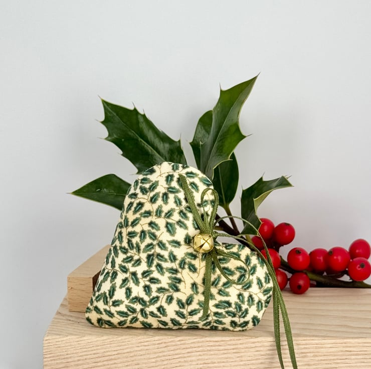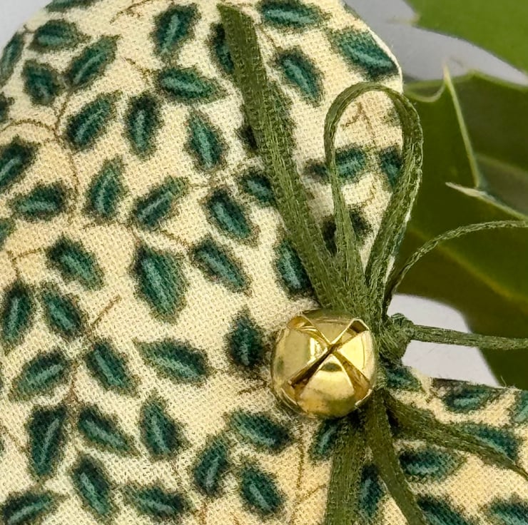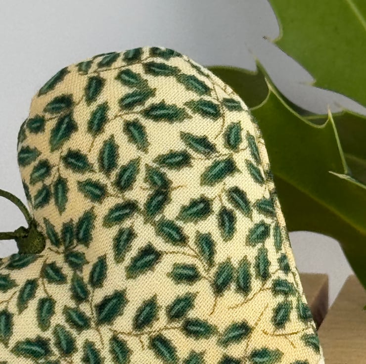 A pretty cotton fabric featuring sprays of green holly leaves against a stippled ecru and mustard-coloured background. This heart is filled with hypoallergenic wool toy-stuffing and with a generous pinch of whole cloves for a particularly warm and spicy Christmas aroma. Finished with shiny little gold jingle bell and with delicate moss-green ribbon hanging ties and bow.