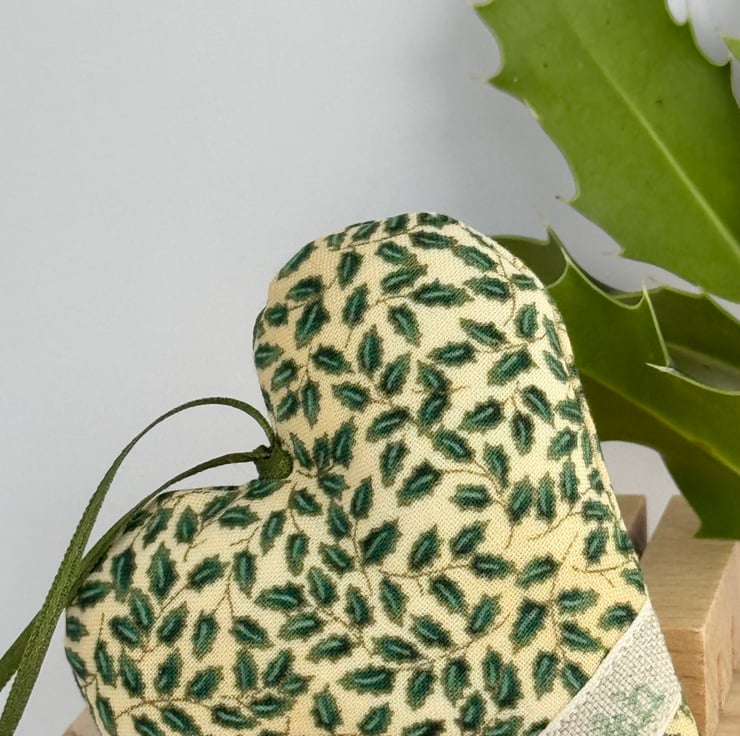 An elegant Christmas heart decoration with an all-over holly sprig pattern.