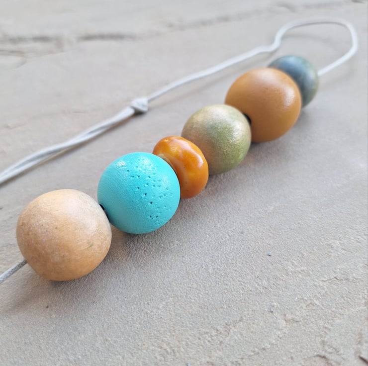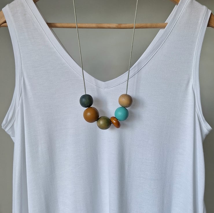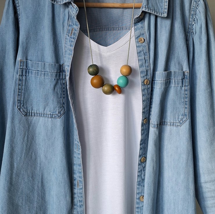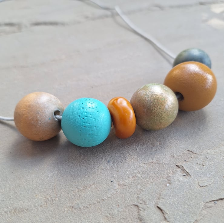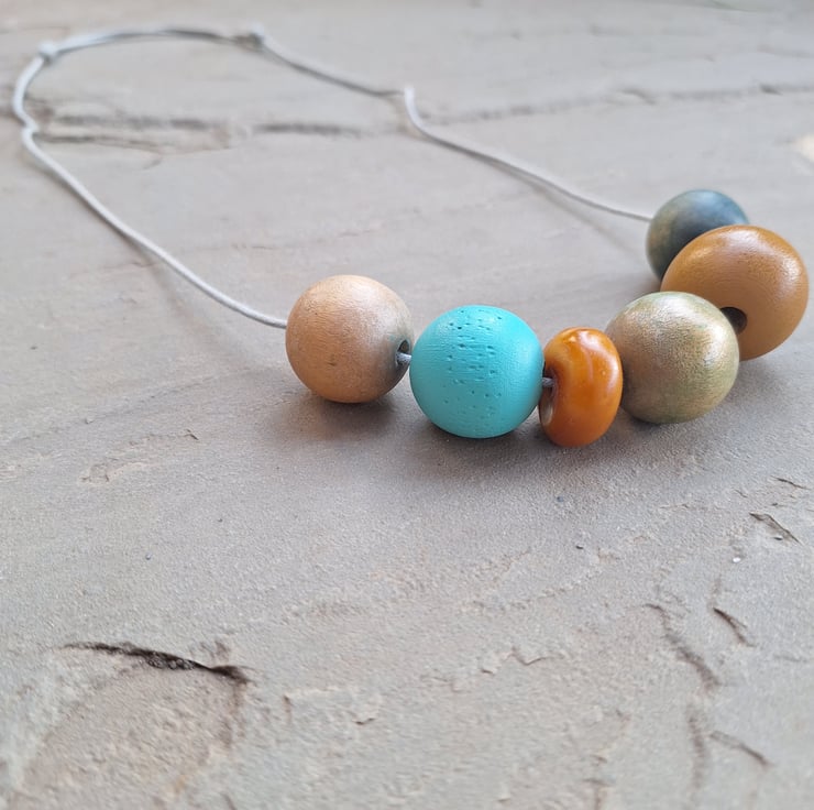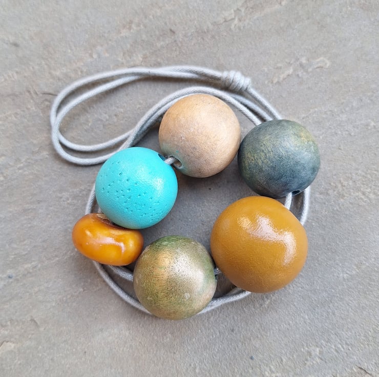 Nala - Autumnal coloured chunky beaded light weight necklace. A mixture of hand painted and recycled beads in gorgeous muted colours including, blues, tan, gold and amber. The necklace can be made to your desired length using the sliding knots.