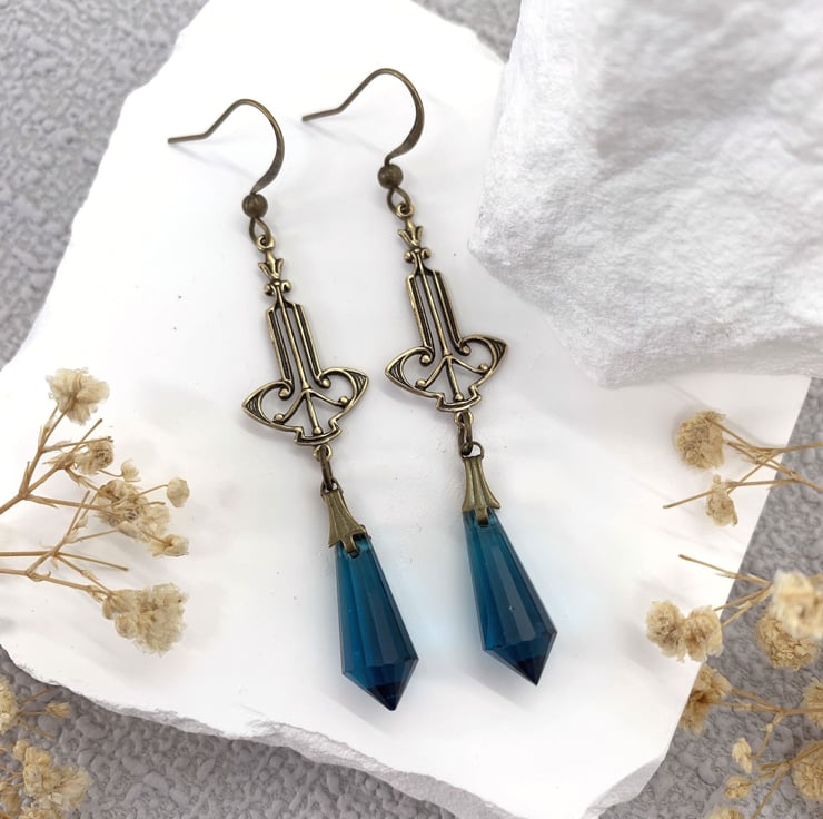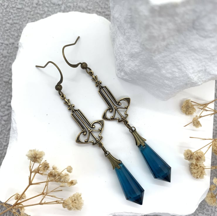 These pretty earrings are made with petrol blue patterned teardrop beads suspended from a gold plated Art Nouveau vintage style connector charm. The teardrop beads are connected with tiny brass tone pinch bails. The earrings are finished with bronze tone ear hooks..