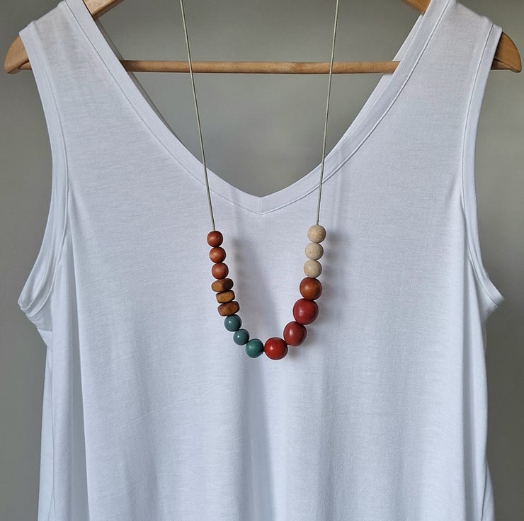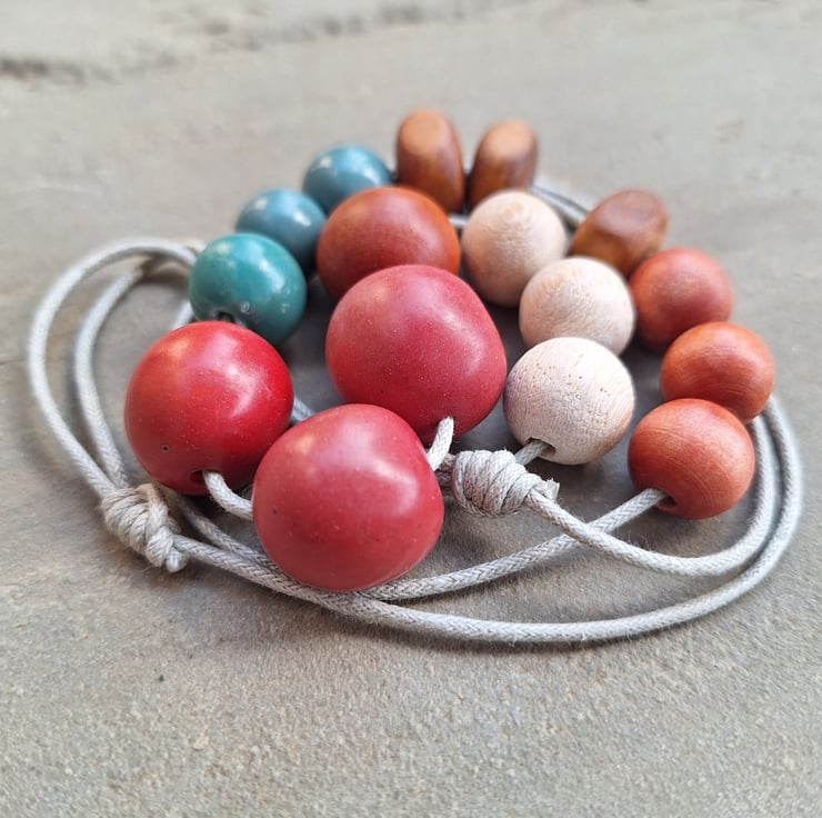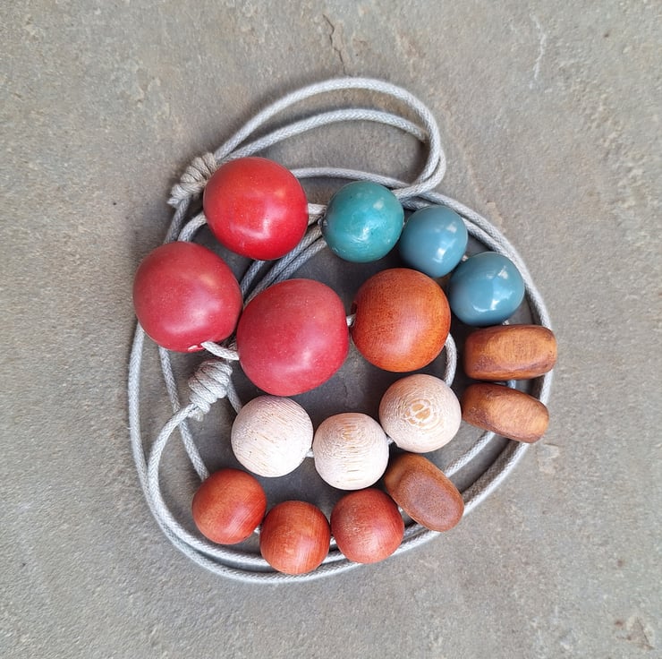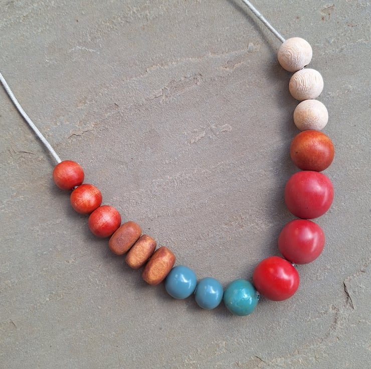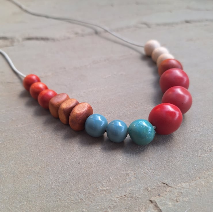 Tutti frutti - Colourful small recycled wooden beaded necklace. Burnt orange, natural, blue and red. You can wear this necklace at different lengths using the sliding knots. Made using wooden and ceramic recycled beads.