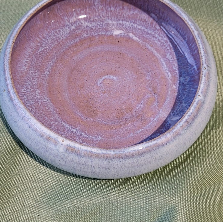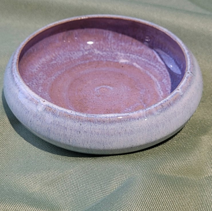 This wheel thrown circular trinket dish has a soft white coloured glaze on its outer surface. It's inner surface has a lilac glaze coating. This piece has a diameter of 12cm and a height of 3cm.