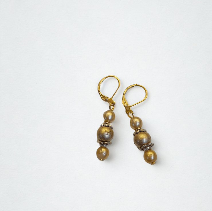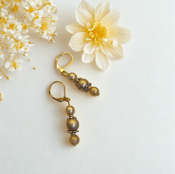 The warmest recycled golden coloured pearl beads in different sizes. Blended with Tibetan silver. Hanging on 24 carat gold plated lever back hooks.