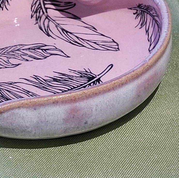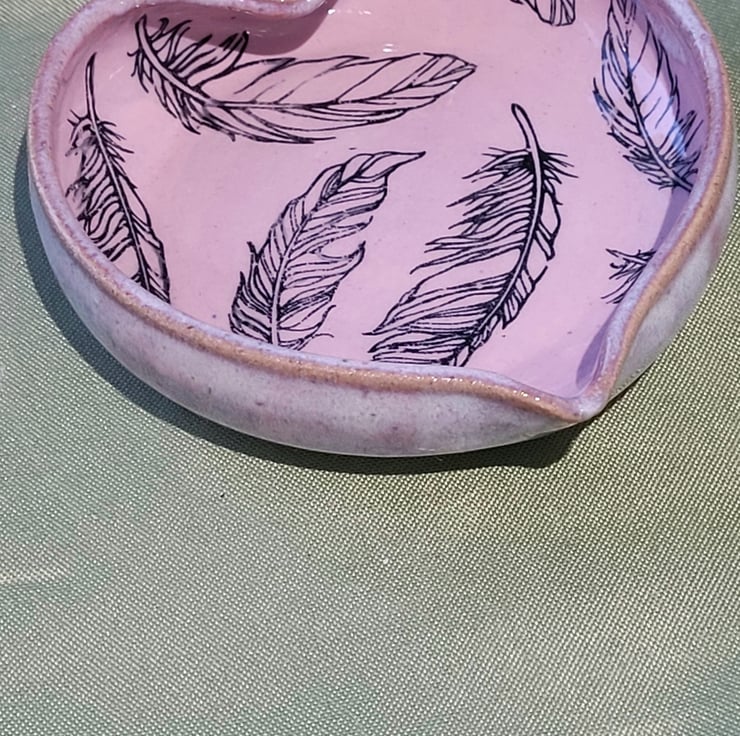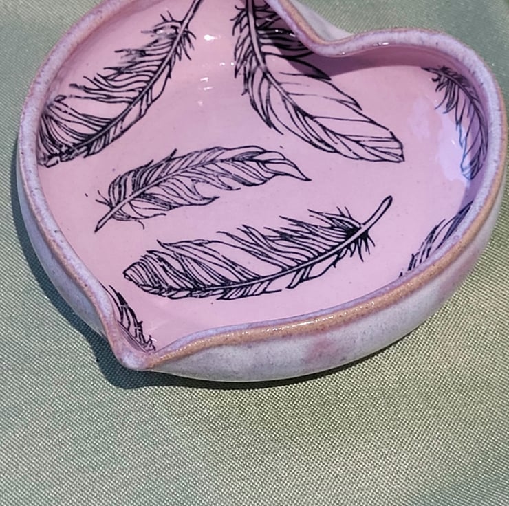This wheel thrown heart shaped trinket dish has a soft white pink coloured glaze on its outer surface. It's inner surface has a pair pink glaze background with feather details. This piece has a diameter of 11.5cm and a height of 3cm.