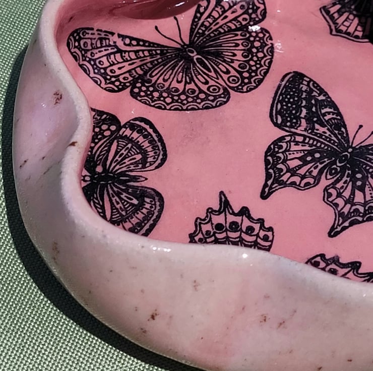 This wheel thrown flower shaped trinket dish has a speckled pink coloured glaze on its outer surface. It's inner surface has a bright pink glaze background with butterfly details. This piece has a diameter of 11cm and a height of 3cm.