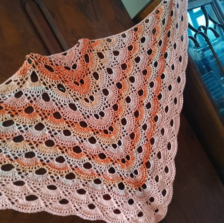 Bring a touch of elegance and warmth to your wardrobe with this handmade crochet shawl, crafted with care and 15 hours of detailed stitching. The shawl features a delicate lace design with scalloped edging, paired with a soft gradient of peach, coral, and blush tones that flow seamlessly together.