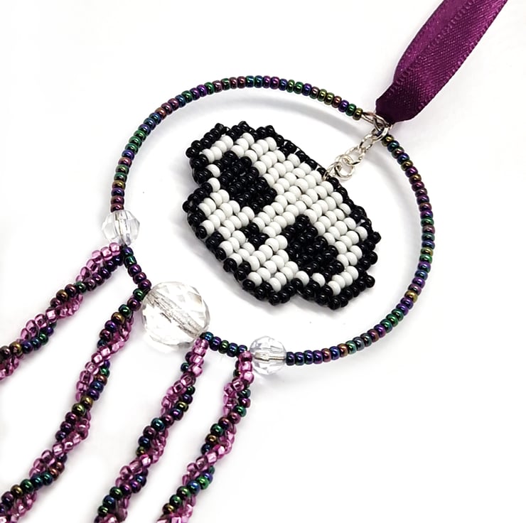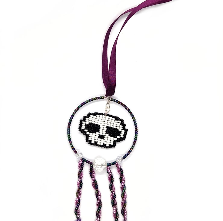 This small ped white and black beaded skull hanging decoration has been lovingly created to bring some funky gothic vibes to your space.