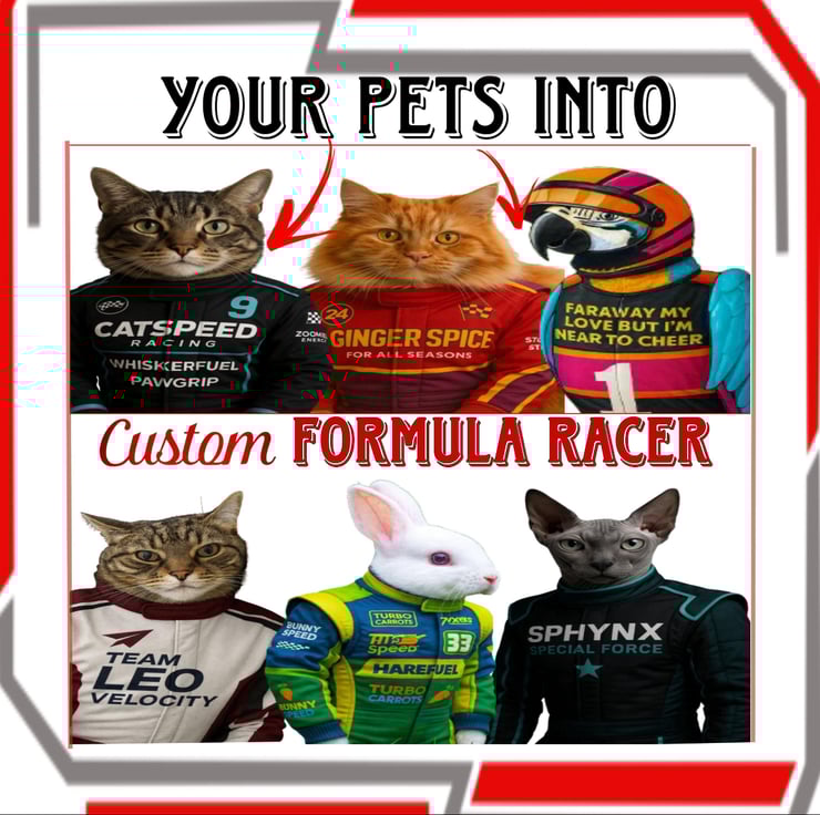 Turn your pet into a Formula Racer Champion with this fun and unique artwork. Your furry friend will be transformed into a Formula 1-inspired racer of your choice, complete with a customised suit. Each piece is printed on high-quality 240gsm glossy A4 photo paper, giving a premium finish that looks fantastic framed or as a gift.