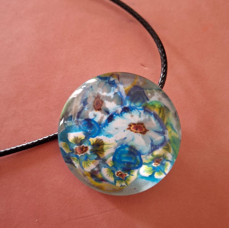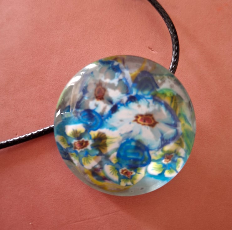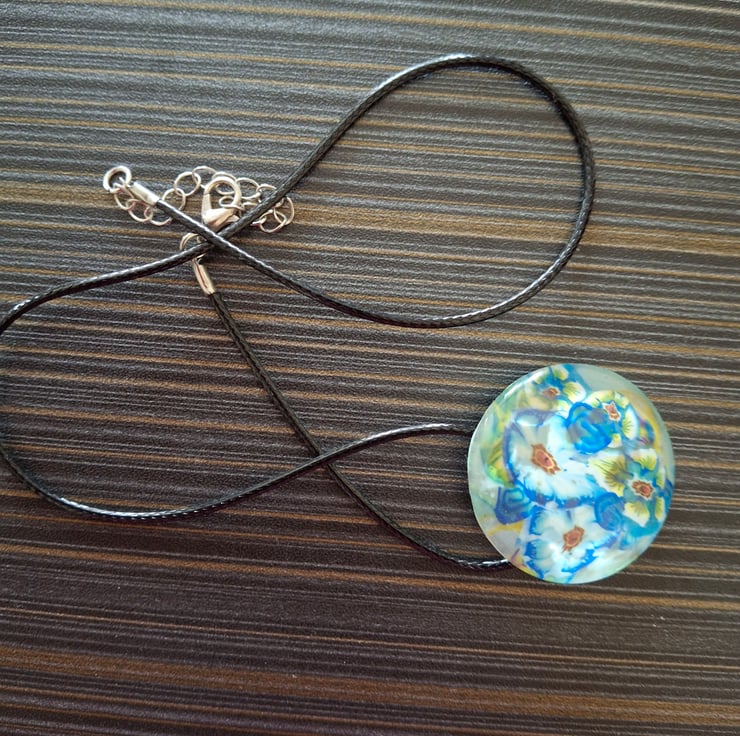 This unique necklace features a beautiful flower pendant made from polymer clay and glass. The pendant hangs from a sturdy black cord which can be easily changed. The necklace is handcrafted with care and attention to detail, ensuring its quality and charm.The necklace is ideal for those who appreciate handmade jewellery and want to add a touch of elegance to their outfit. The stunning floral design caries a good mood and will compliment any outfit. Blue colour and floral design make it an unique gift for a loved one.