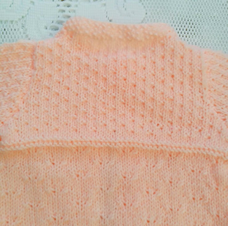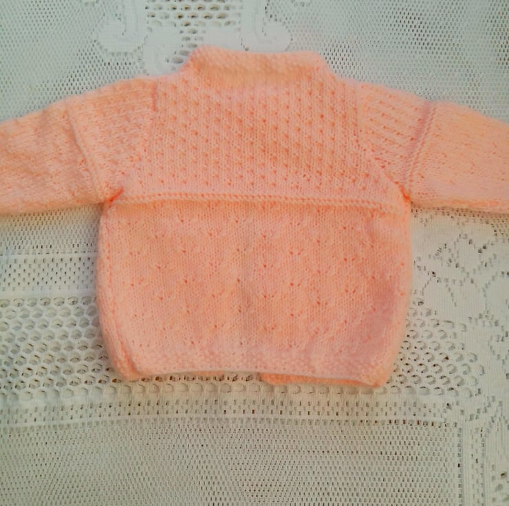 A very pretty hand knitted round neck cardigan in peach double knitting yarn. It is not currently in stock but it can be made for you in a size and colour of your choice. Please see below for the available sizes and prices and state the colour required when you order. Please allow approximately 2 weeks processing time for the cardigan to be made and posted to you.