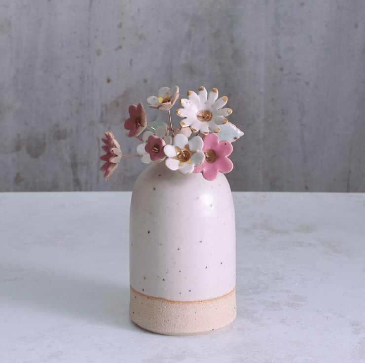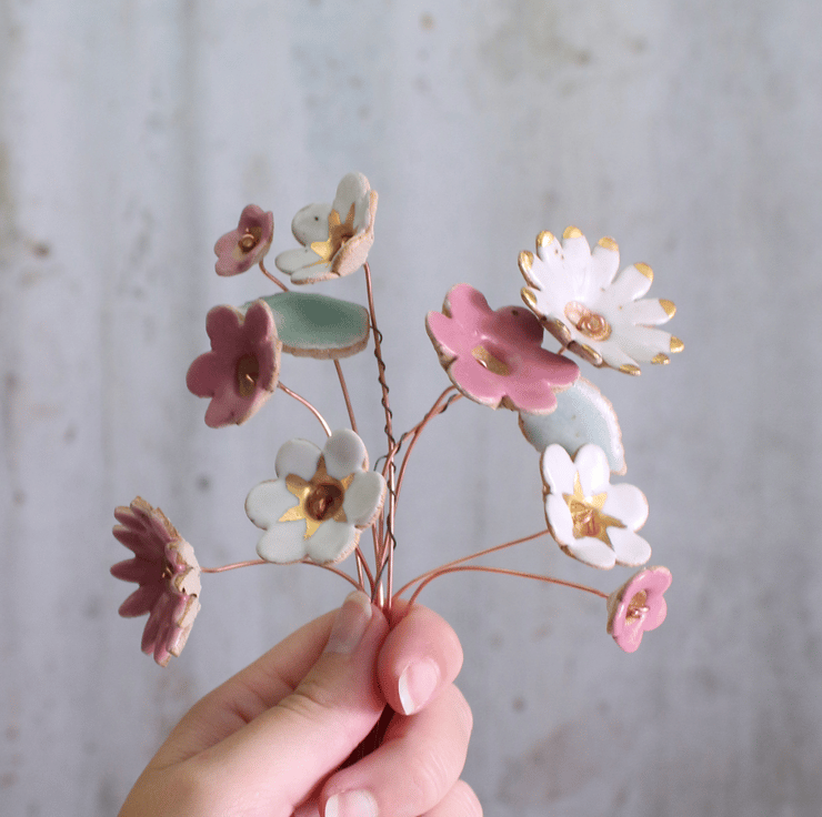 Bright, bold, and everlasting – this handmade ceramic flower bouquet combines striking fuchsia blooms with soft white flowers, each delicately finished with real gold lustre for a touch of sparkle. Handcrafted in our Dartmoor pottery studio, every flower is unique, making each bouquet a true one-of-a-kind creation.