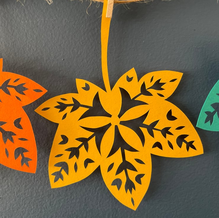Hello autumn! Celebrate this beautiful season with a papercut autumn leaf garland! This garland is made up of six papercut leaves with a folk-art style design, very carefully cut out by hand using a scalpel so each leaf is unique. The leaves are attached to a length of pale brown twine using mini clothes pegs. Each leaf is 11.5 x 9 cm.