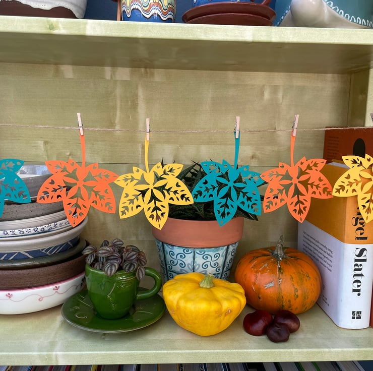 The garland comes in a cellophane envelope containing six leaves (or more if requested), a 1.20m length of string and eight mini clothes pegs (it's always good to have a couple of spare ones just in case!) If you request more leaves an extra 20cm of string and additional pegs will be included accordingly.