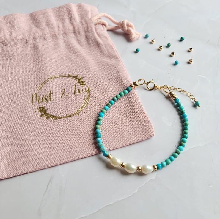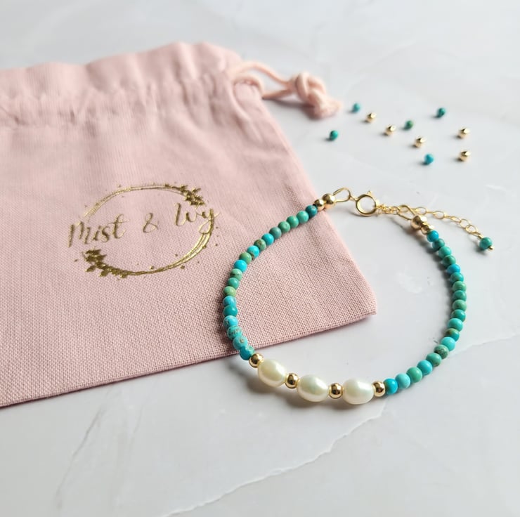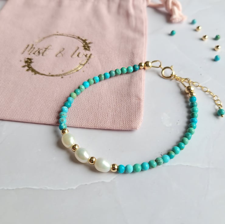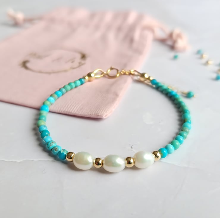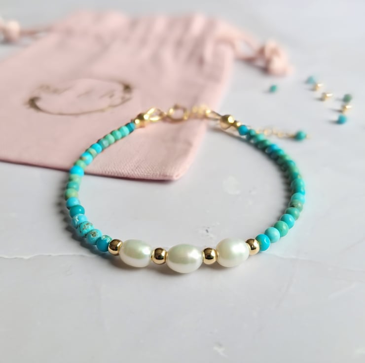 This dainty, boho gemstone bracelet is handmade with turquoise, freshwater pearls and gold filled beads. It's delicate, versatile and great for stacking. Perfect for anniversaries, for treating yourself, or as a meaningful gift to celebrate a December birthday.