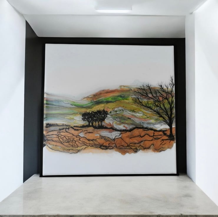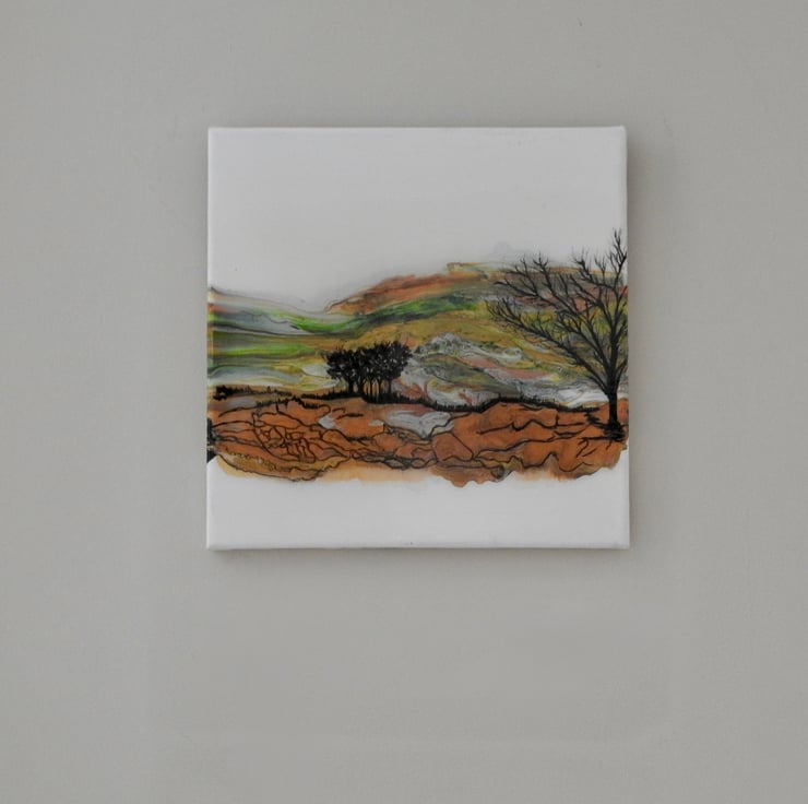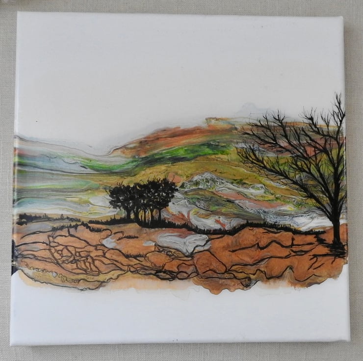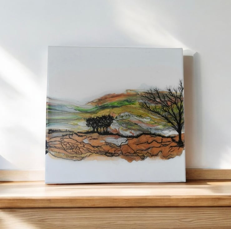 A fluid acrylic painting showing Rothbury hills Northumberland in late Autumn on a windy bright day , the painting is finished with a coat of eco resin that gives a glass like finish .