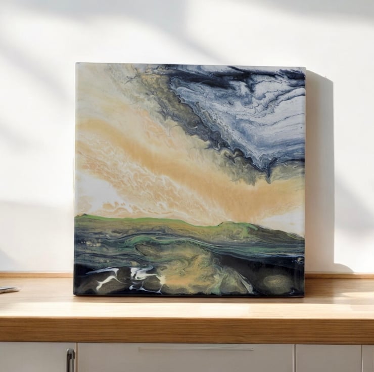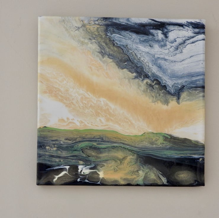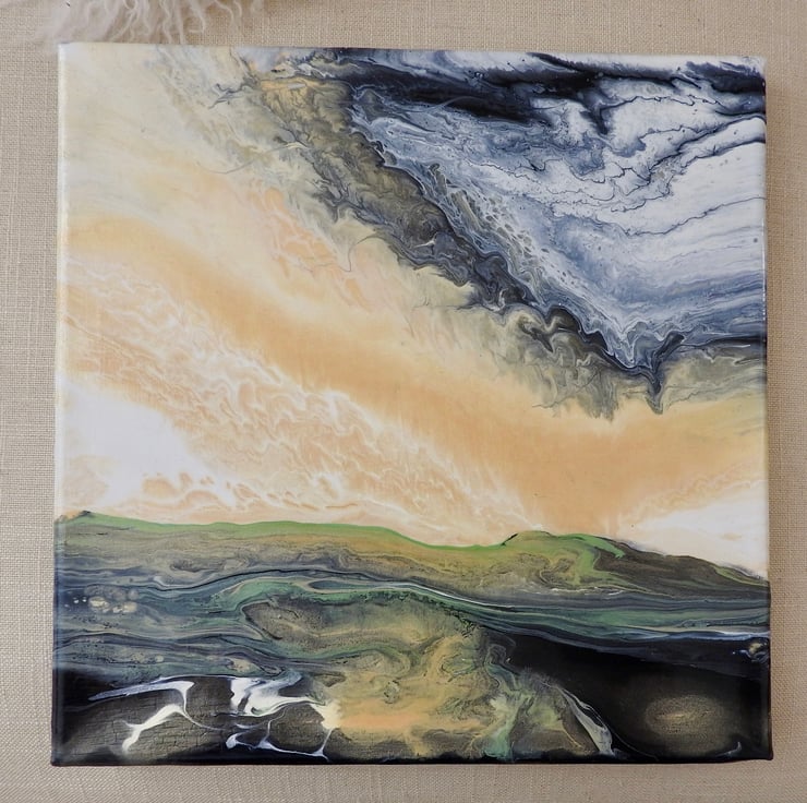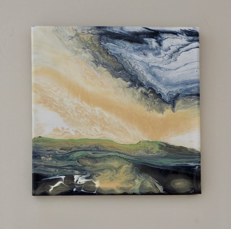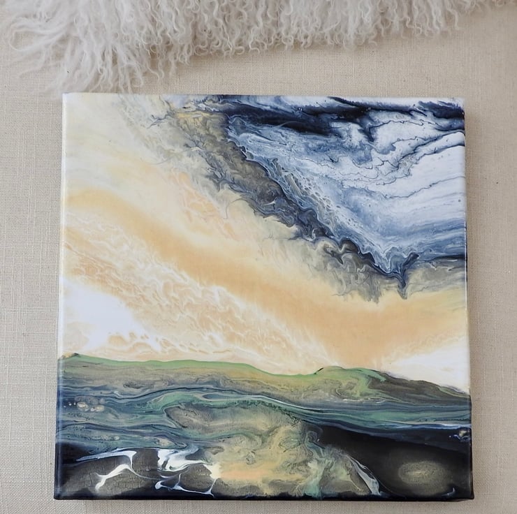 Measuring 30 cms square on canvas , an original artwork made with fluid art and traditional techniques . Finished with high gloss varnish on stretched canvas .