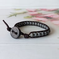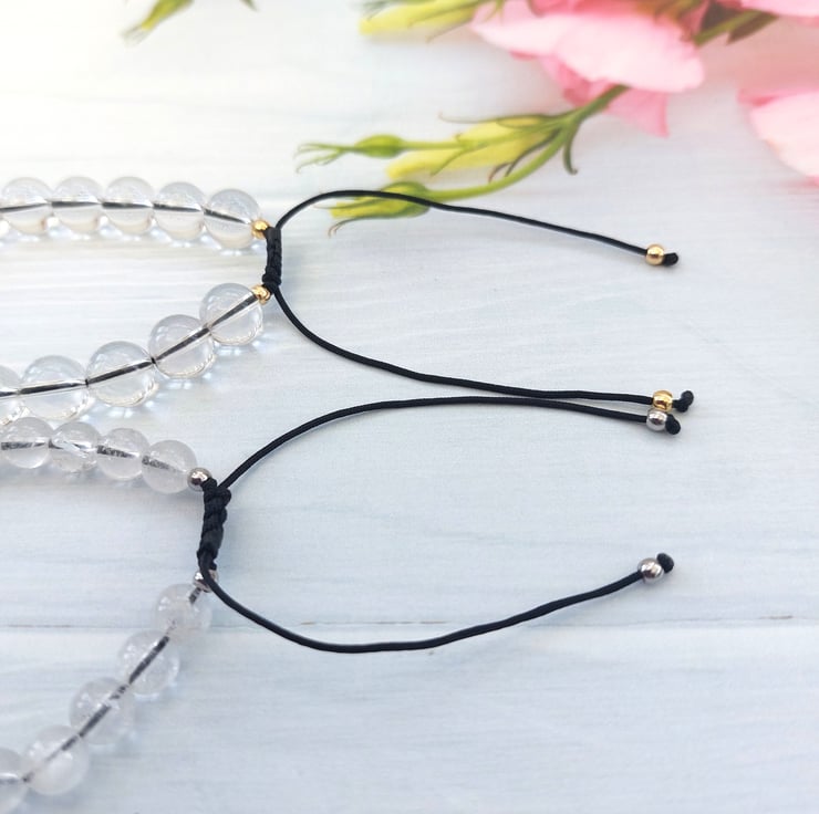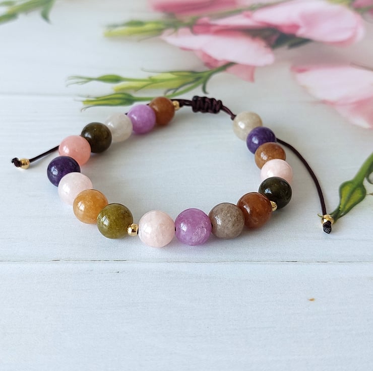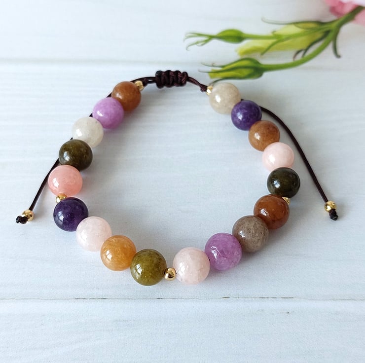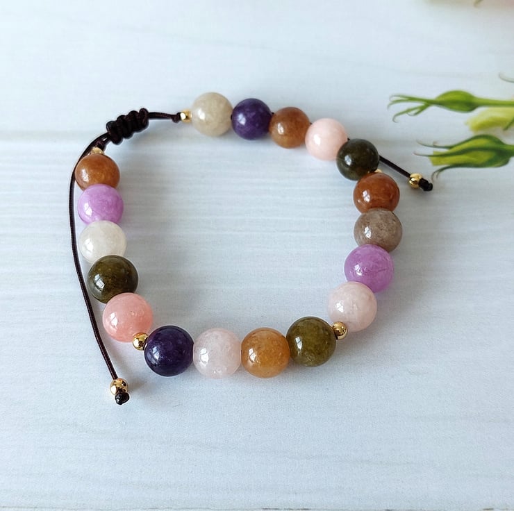 Created from 8mm gemstone beads strung on brown durable cord and finished with a sliding knot making the bracelet fully adjustable. Finished with tiny silver or gold tone stainless steel beads.