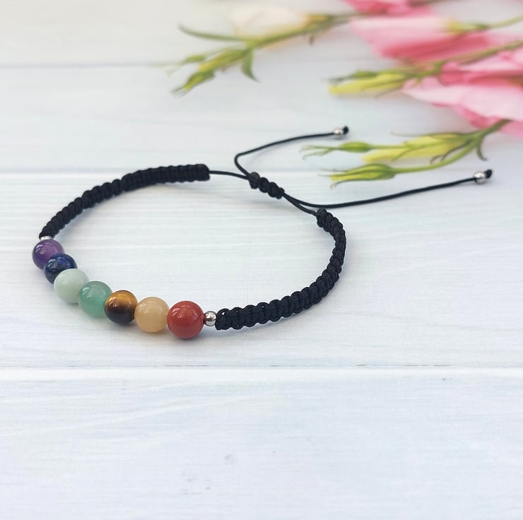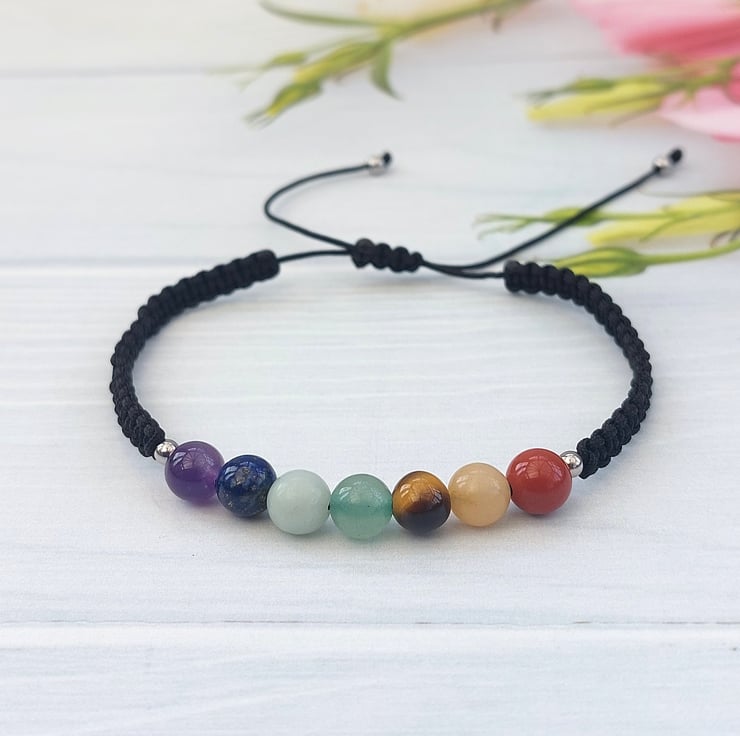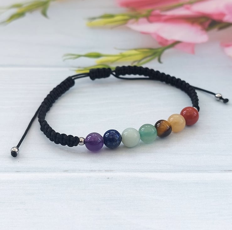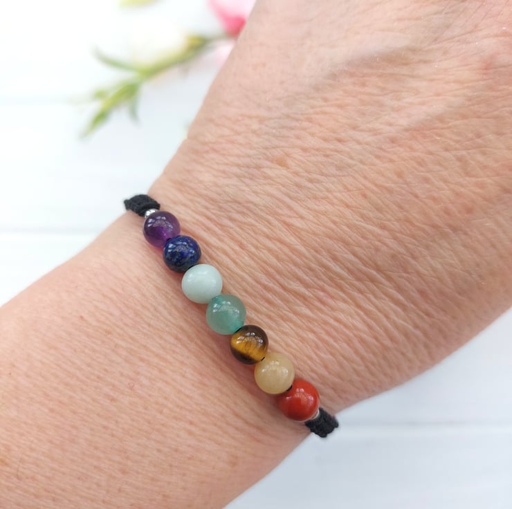 An adjustable chakra bracelet created from 6mm gemstone beads - one for each chakra.
