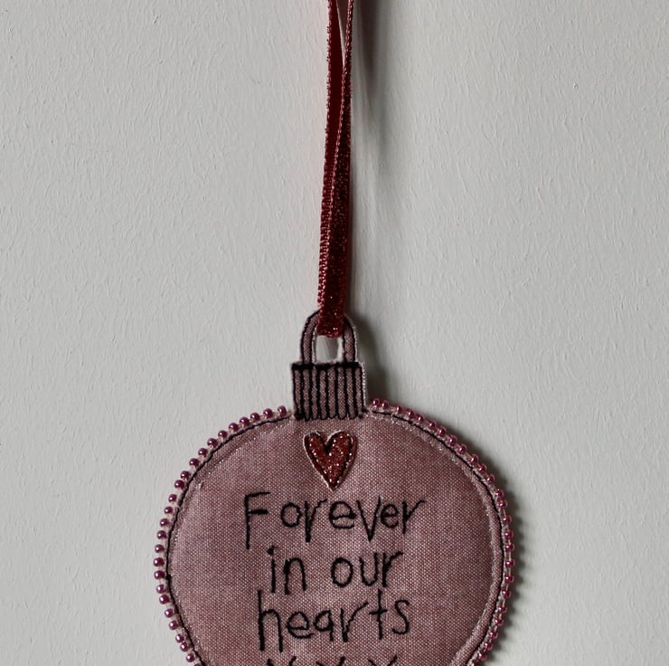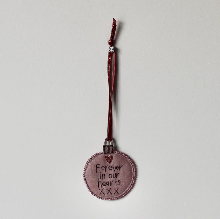 A delightful hanging decoration which is created using multiple layers of cotton cloth, 100% wool felt, glitter cloth, glass seed beads and free hand machine embroidery. It is cut out by hand using a very sharp pair of scissors.