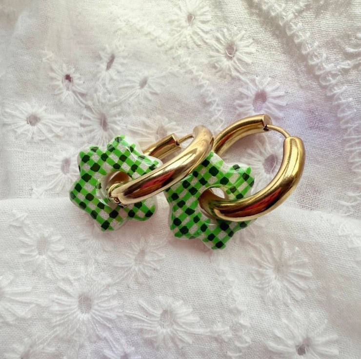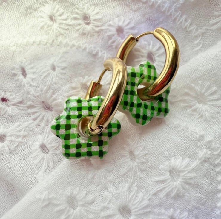 These earrings feature hand-painted Green gingham flower charms on 18K gold plated hoops. Lightweight and comfortable, they’re a fun statement piece that adds a touch of retro charm to any outfit.