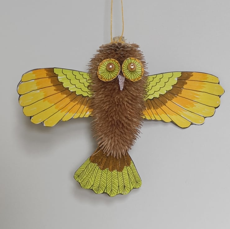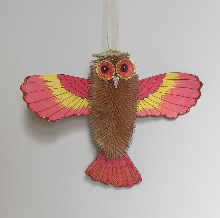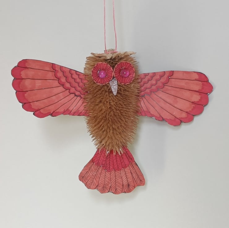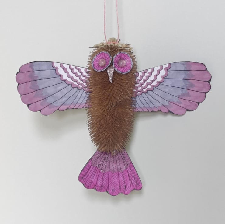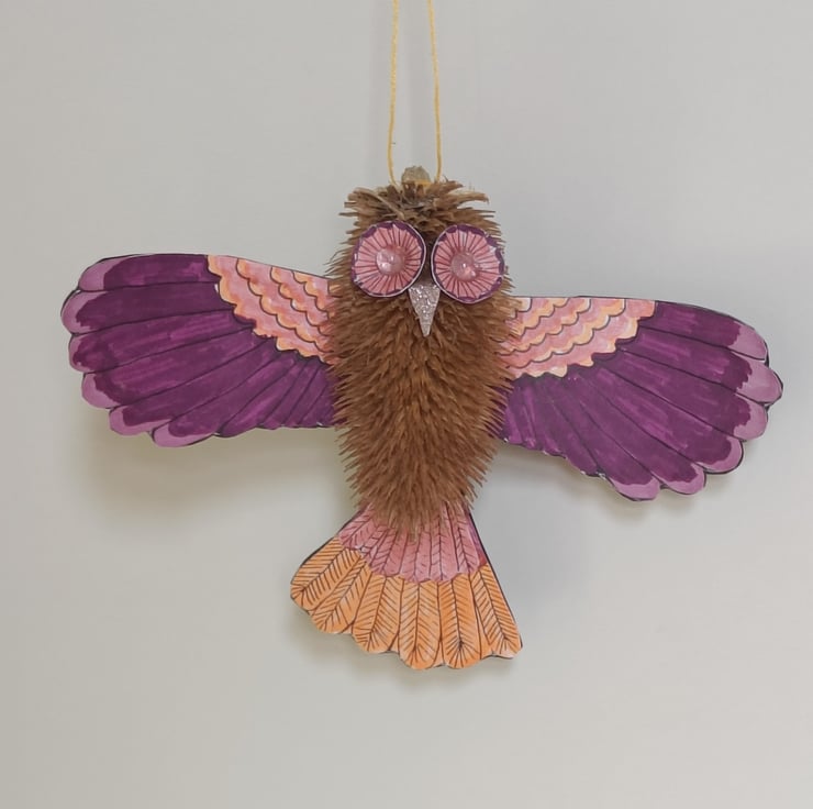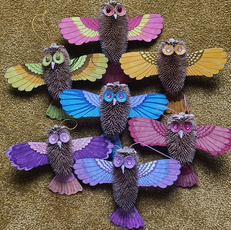 Designed in 2025 each is made with cardboard eyes, wings and tail which has been individually coloured in with permanent ink in a wide variation of colours.