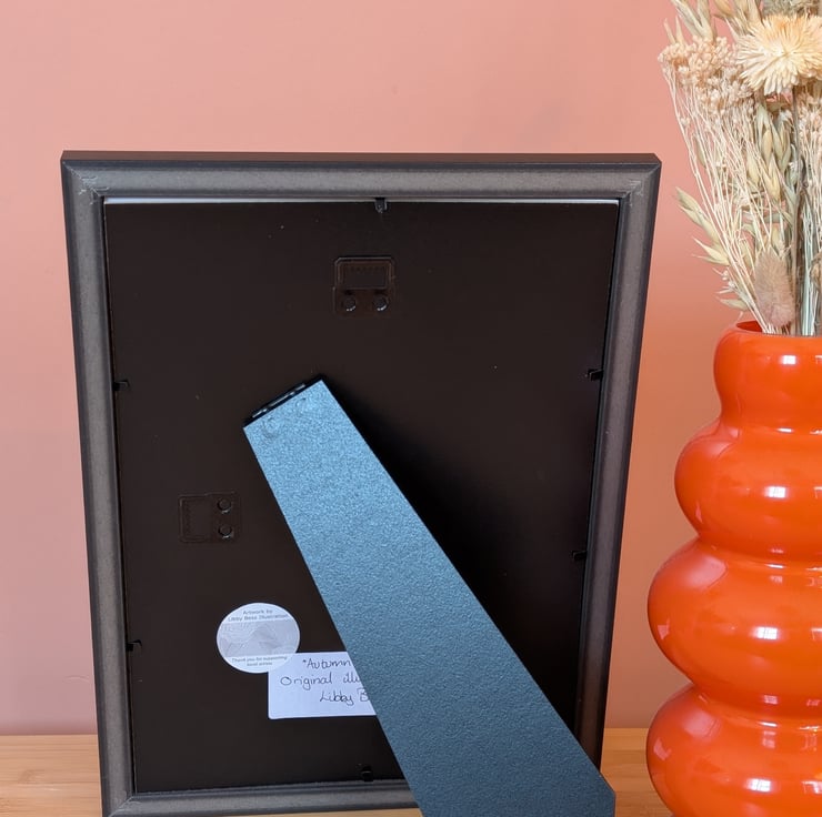 Picture can be stood up as shown in the photos but also has fixtures for hanging if preferred. The frame has glass front rather than acrylic making it a much nicer finish.