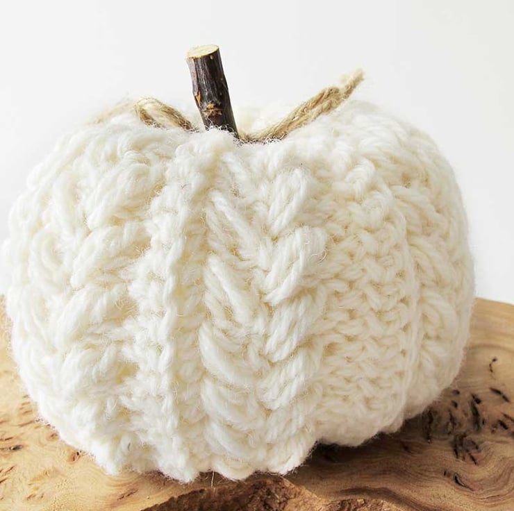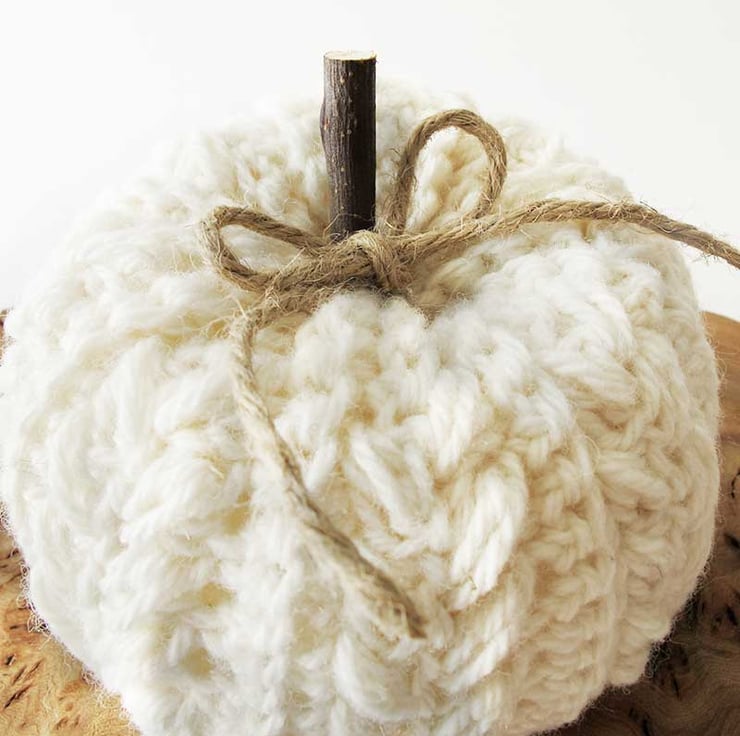 This is a beautiful pumpkin decoration crocheted by hand in a lovely soft yarn. The yarn is an acrylic/wool blend, in a soft creamy white. It has been stuffed with a high grade hollow fibre stuffing, it has a real wood twig for it's stem and is finished off with a natural jute twine bow. It's a perfect Autumn or Halloween decoration and would make a great gift. It measures approximately 14cm diameter and 11.5 cm high including stalk.