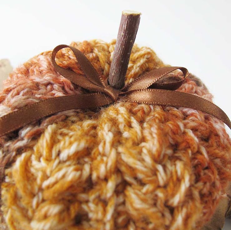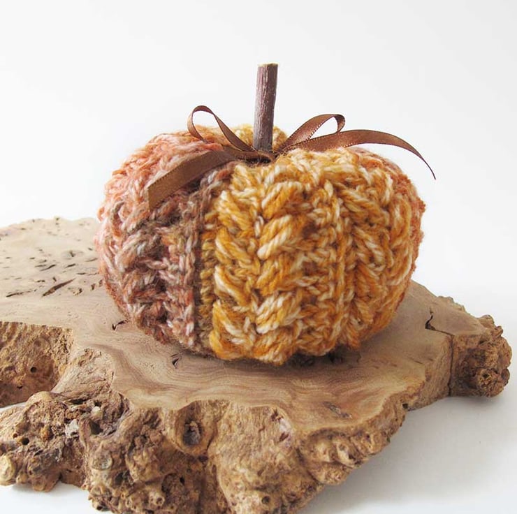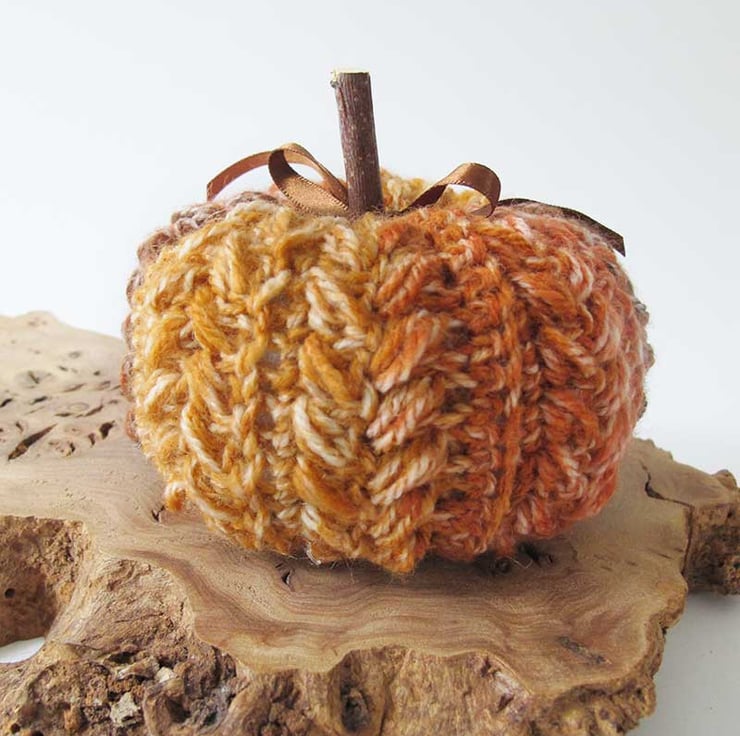 This is a beautiful little pumpkin decoration crocheted by hand in a lovely soft yarn. The colours are mottled in orange, cream, deep yellow and rusty brown.It has been stuffed with a high grade hollow fibre stuffing, it has a real wood twig for it's stem and is finished off with a pretty co-ordinating brown satin ribbon. It's a perfect Autumn or Halloween decoration and would make a great gift. It measures approximately 11cm diameter and 9cm tall including stalk.