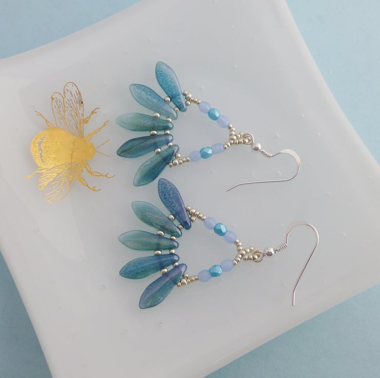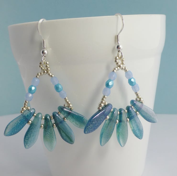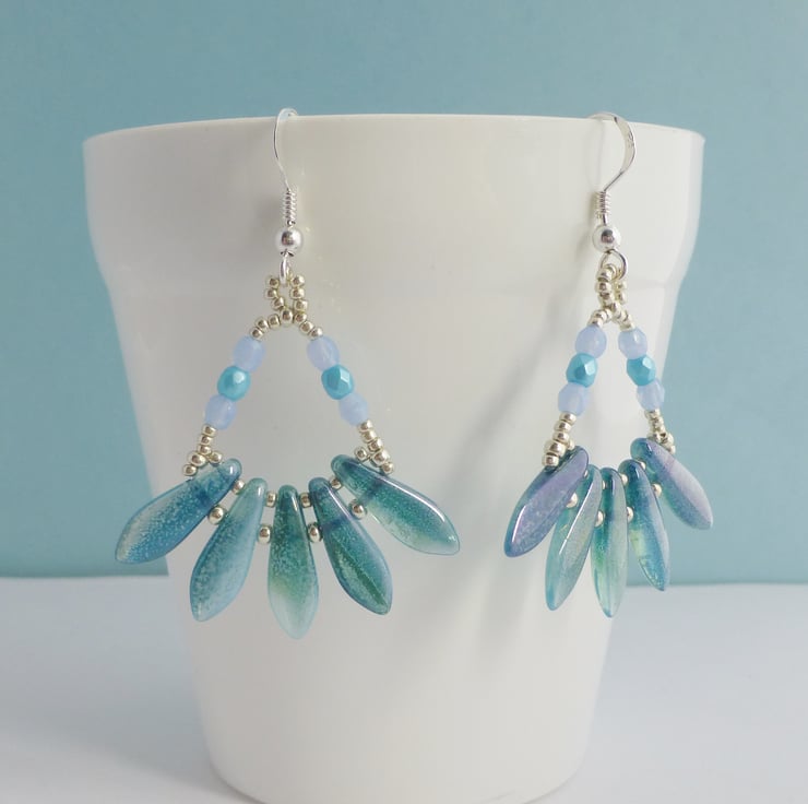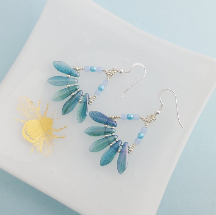 Pretty earrings hand stitched from glass beads in shades of blues, greens and silver in a triangular shape. These drop earrings are approx 4cm long not including the earwires.