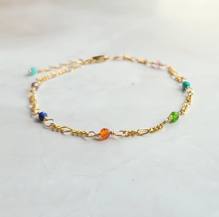 This colourful mixed gemstone bracelet is handmade with a selection of gemstones including turquoise, tourmaline, cubic zirconia, lapis lazuli, amazonite, and chrome diopside, The gemstones have been individually wire wrapped with care onto a beautiful figaro chain. The bracelet is finished with a lobster clasp, and is adjustable from 17-20cm with a small extension chain. It is 14kt gold filled and hypoallergenic.