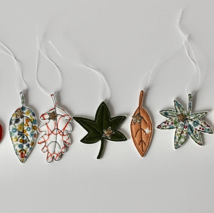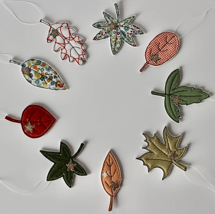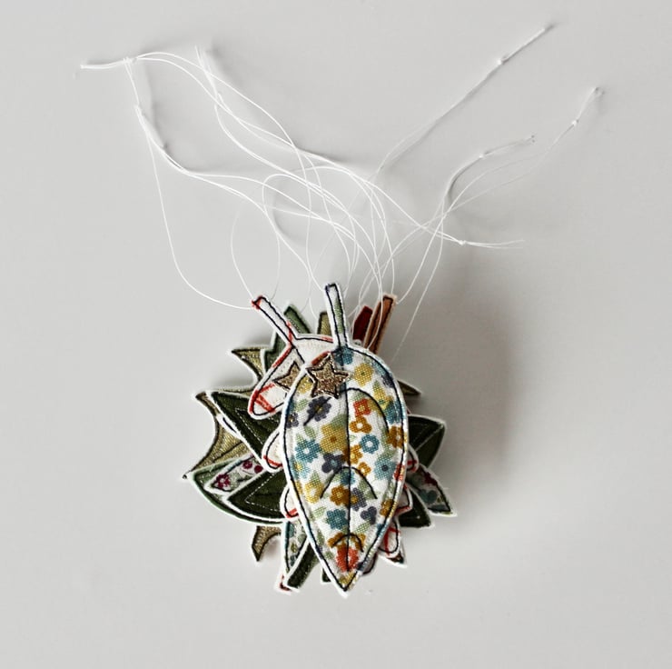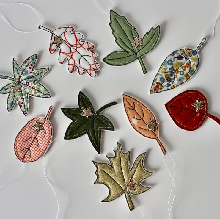 Each leaf is sewn using a combination of 100% wool felt, cotton cloth, glitter cloth and free hand machine embroidery; multiple layers of cloth are sewn together and cut out by hand using very sharp scissors.