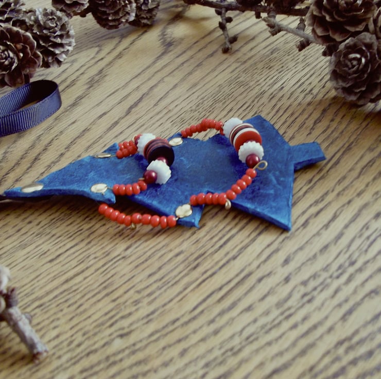 Blue Leather and Vintage Red Bead Christmas Tree Ornament