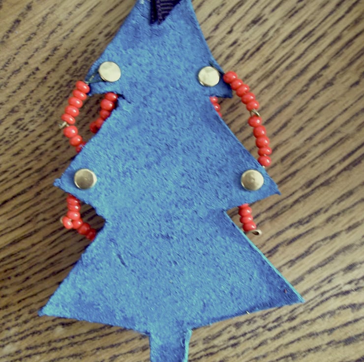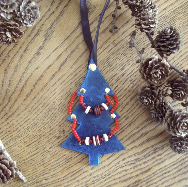Handmade genuine leather Christmas tree ornament. This decoration features a choice of a teal blue, ( the blue is more teal but my screen makes it look more like a royal blue) mustard yellow or burgundy (listed separately) leather sourced sustainably, designed in the shape of a Christmas tree. It is adorned with vintage beads in red, white, burgundy, and black, meticulously re-strung onto wire to create tinsel garlands, complemented by a black ribbon for hanging. The ornament is detailed with gold-coloured rivets. The main body of the tree measures approximately 12.5 cm (just under 5 inches) in height and 6 cm (just under 2.5 inches) in width.