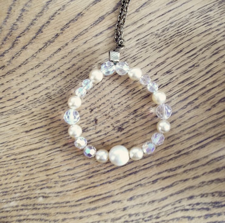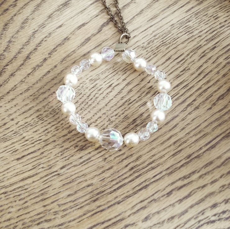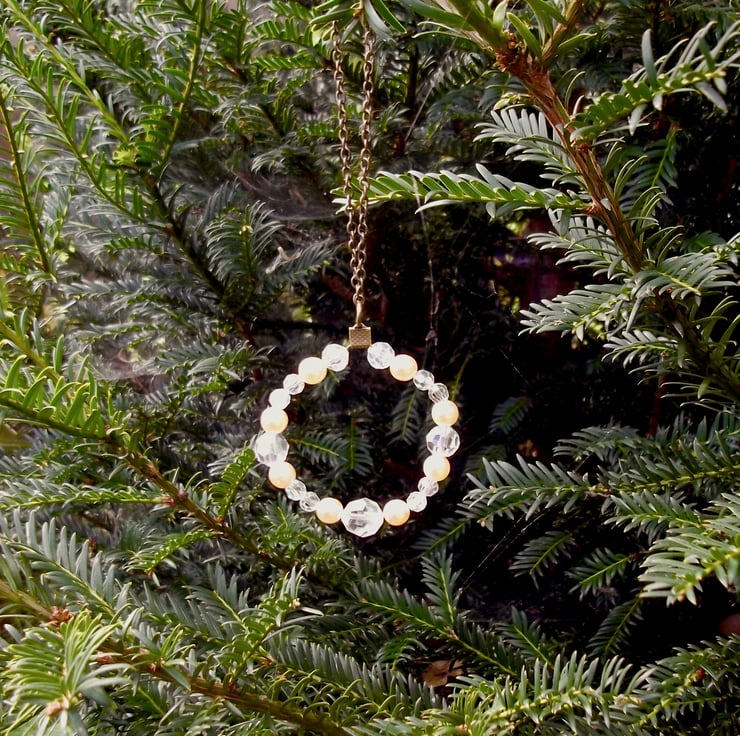Christmas tree ornament is crafted from vintage cut glass crystal beads and vintage pearls, meticulously restrung onto wire to form a circular design. It features a golden gunmetal coloured metal clasp attachment at the top, accompanied by a coordinating hanging chain. The approximate dimensions of the ring are 6 x 6 cm.
