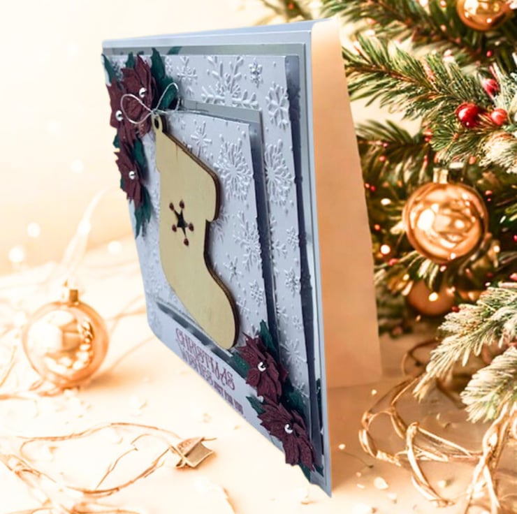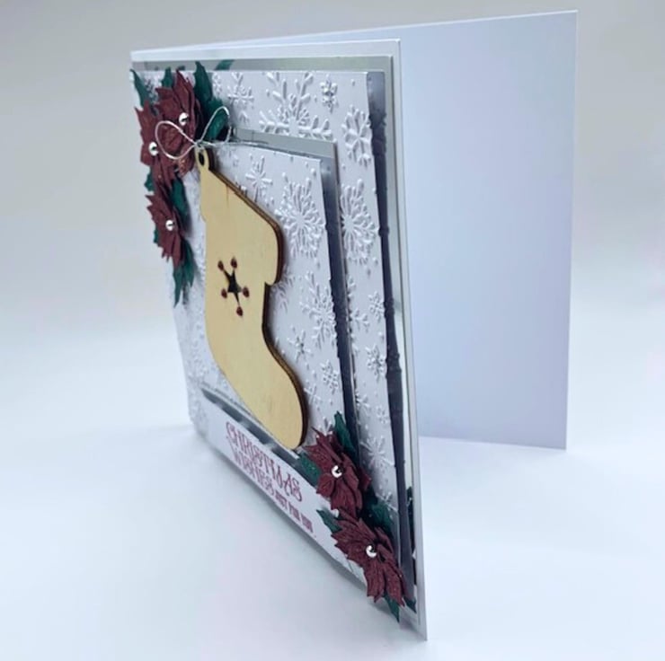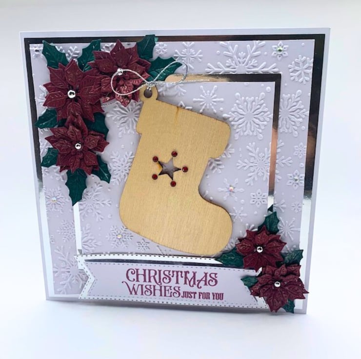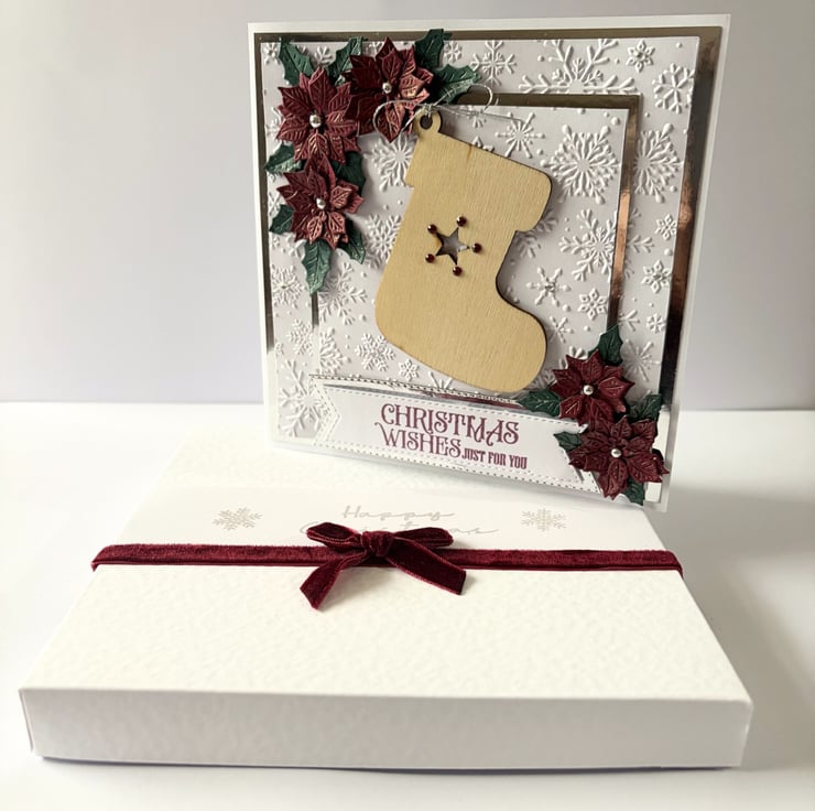 A Luxury handmade 6x6 Christmas card featuring a wooden stocking decoration, hand-layered poinsettias, embossed snowflake detail. Finished with silver mirror card, silver twine, delicate silver pearls, ruby gems, and sparkling crystal accents, it comes presented in an elegant white gift box with the card wrapped in soft silver tissue, envelope, and hand stamped belly band with velvet ribbon - the perfect keepsake card or festive gift.