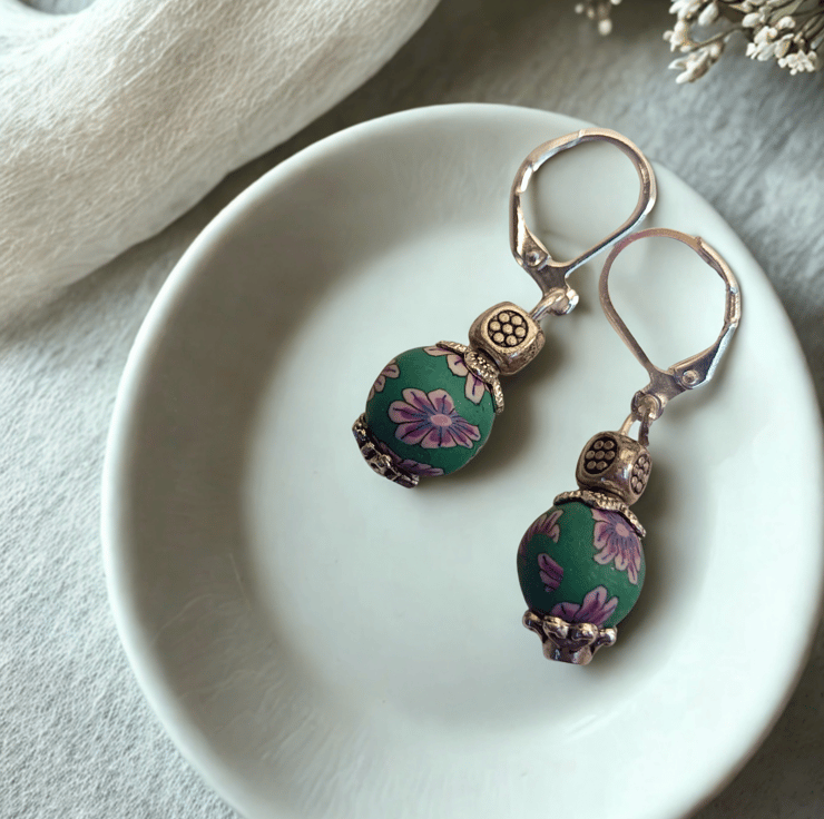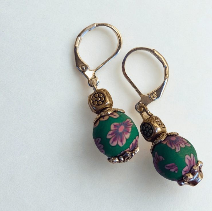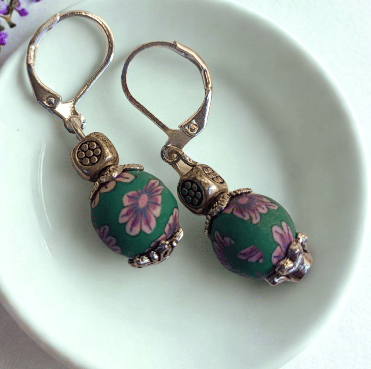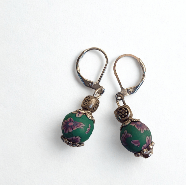Lovely round green polymer clay beads with a floral pattern in purple, white and blue. Encased in two halves of a pretty Tibetan silver flower and blended with a little Tibetan silver decorative bead. Hanging on a lever back hooks in 925 silver.