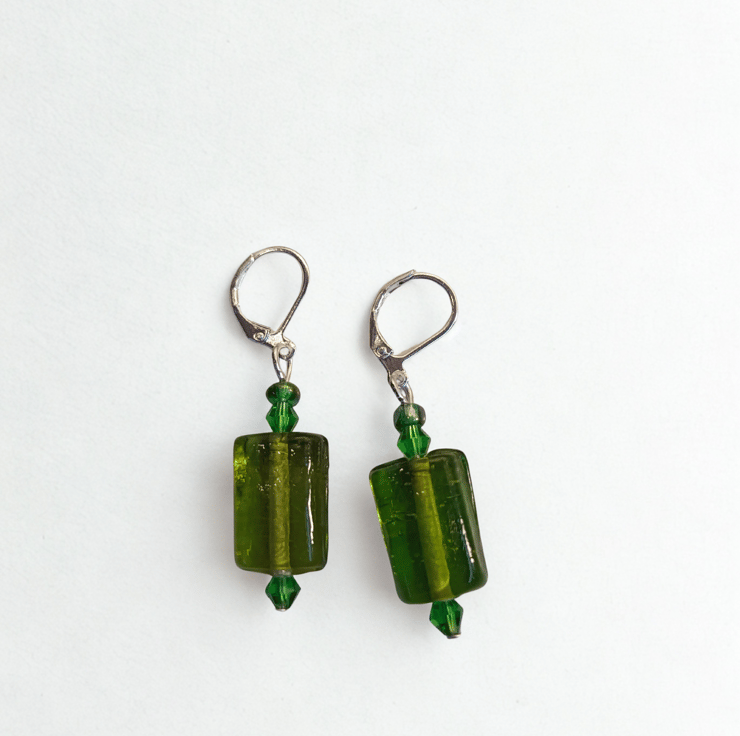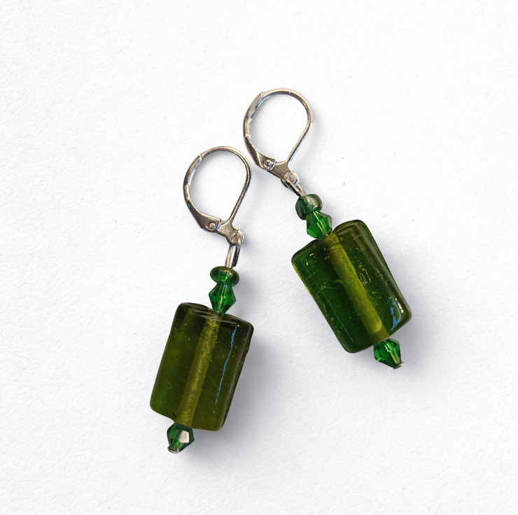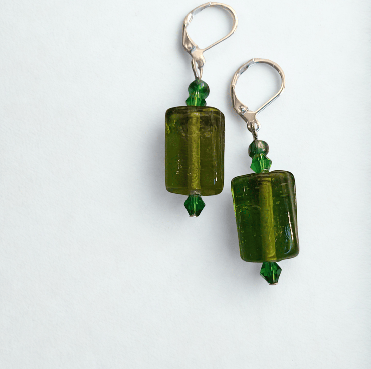 These green glass beads are fab! I took one look at them and said 'Spangles!' For anybody under 50 these were coloured sweets in the 1970s that looked like these earrings! Green glass spangle beads with tiny green faceted beads hanging on 925 silver lever back hooks.