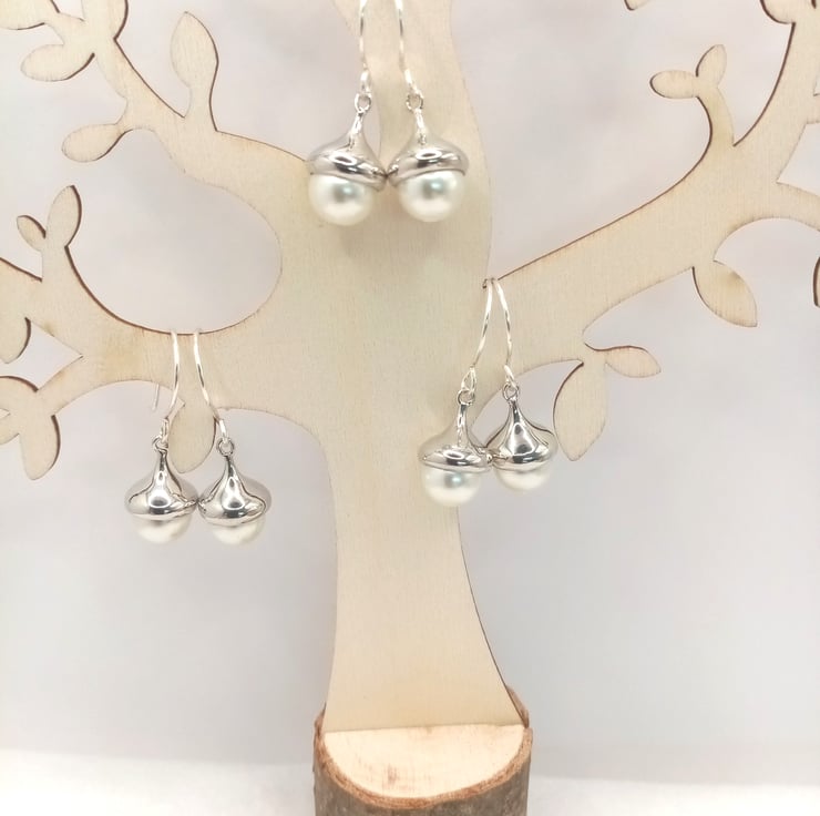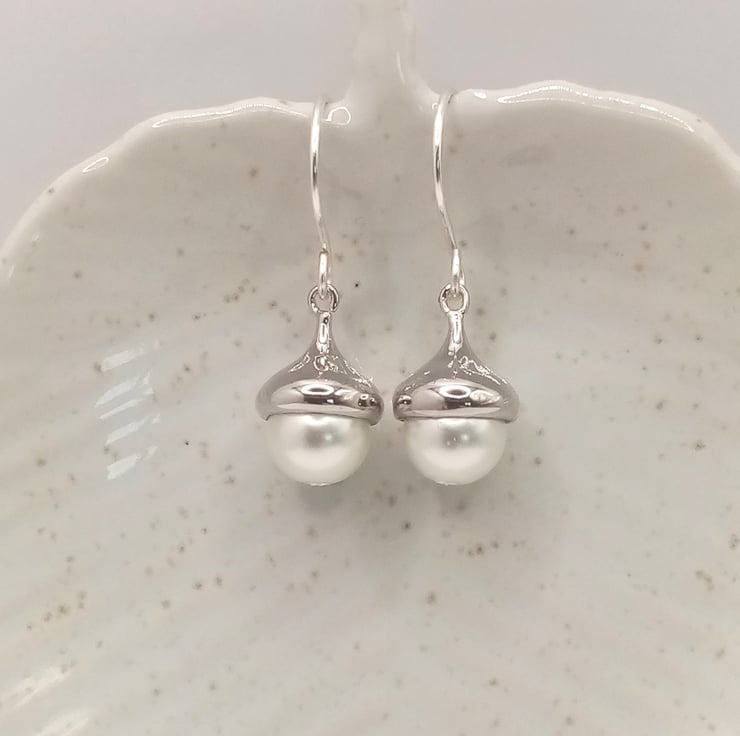 These acorn earrings are made using rhodium plated acorn cap bead bails with 8mm glass pearl beads.