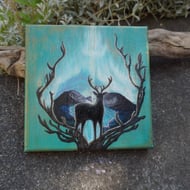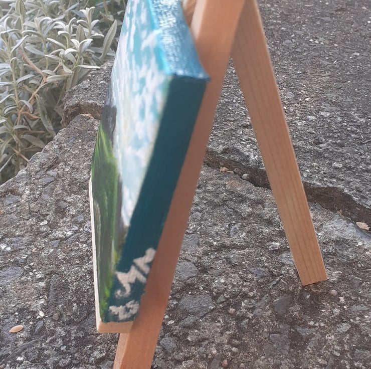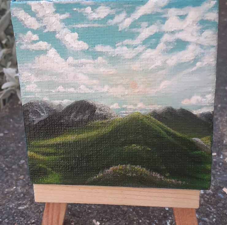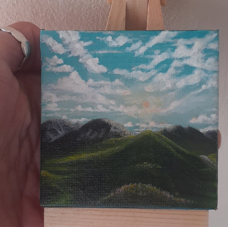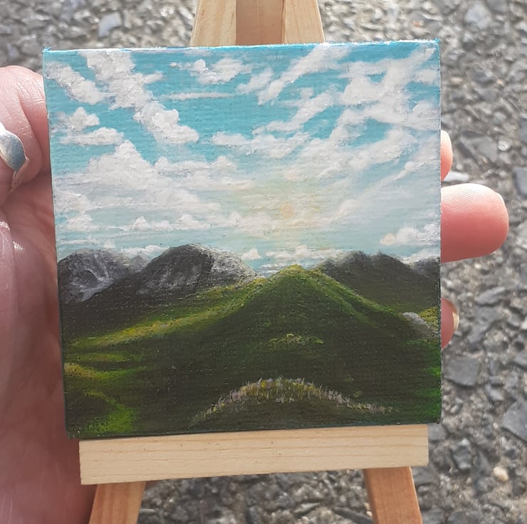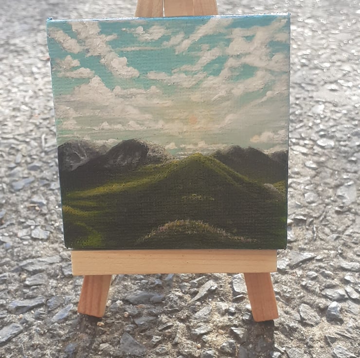 Mini acrylic painting of the majestic Paps of Jura, Scotland -- 7x7 cm/2.75 inch. Varnished. Comes with the easel pictured.