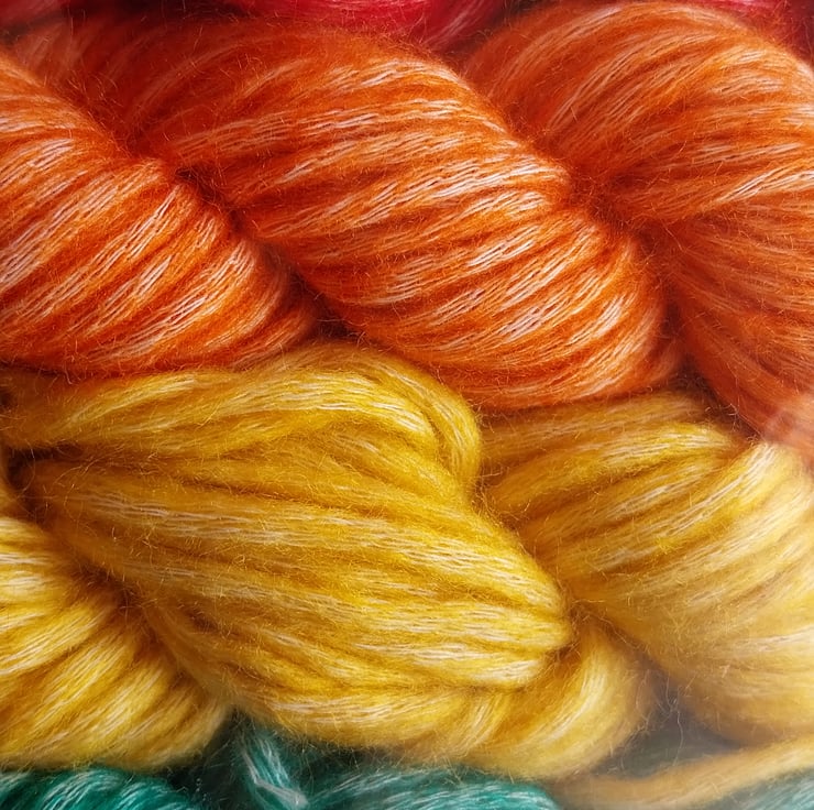 A lovely, soft, Aran weight 60/40 Cotton/Acrylic chainette yarn in a pack of 7 Rainbow colours.
