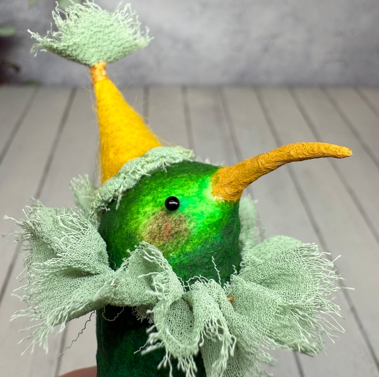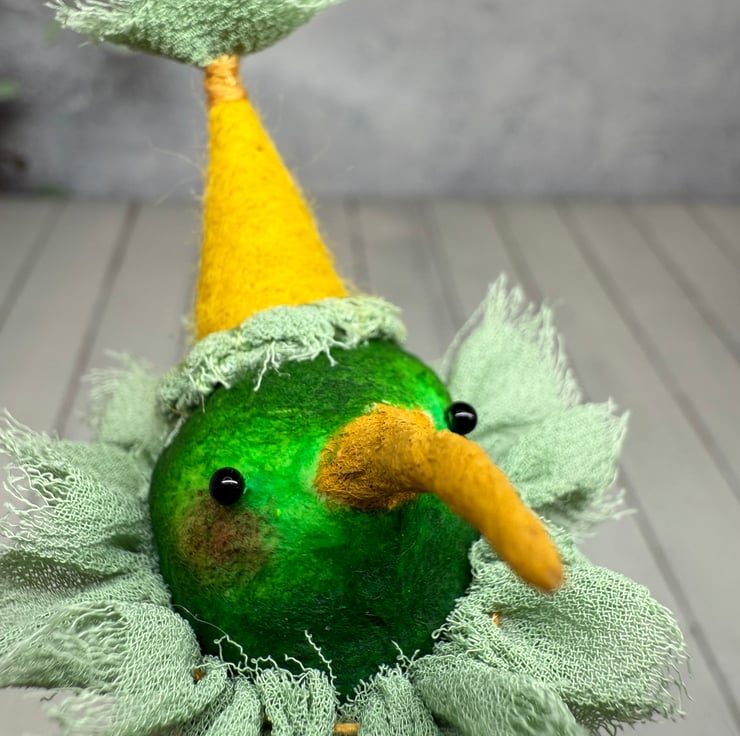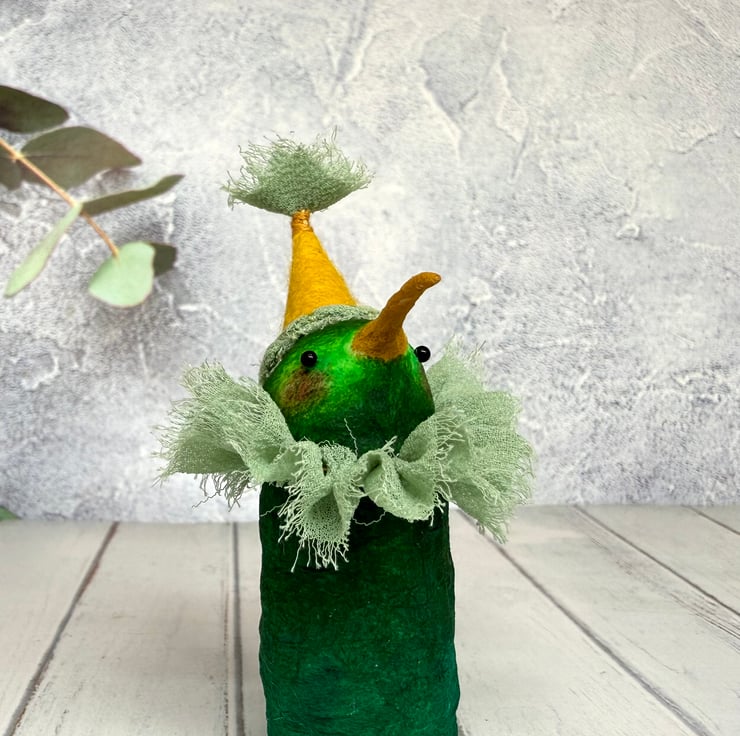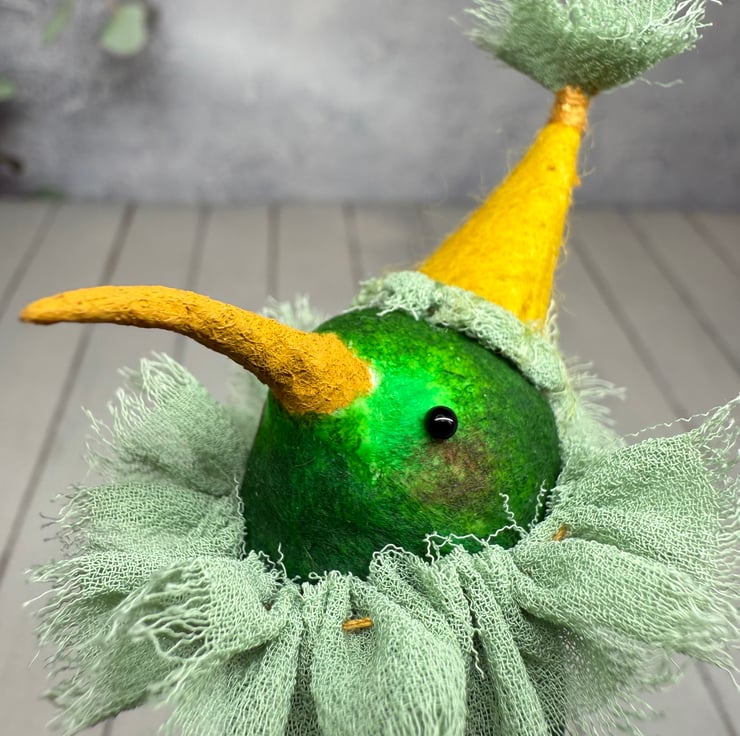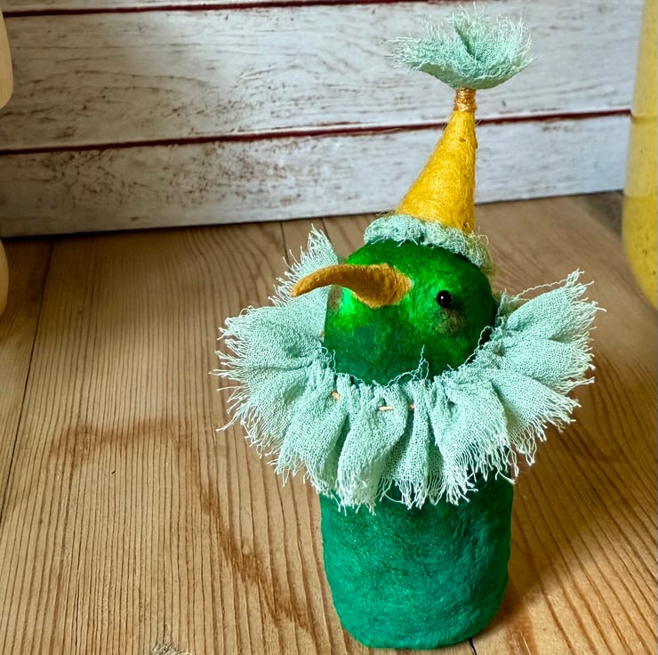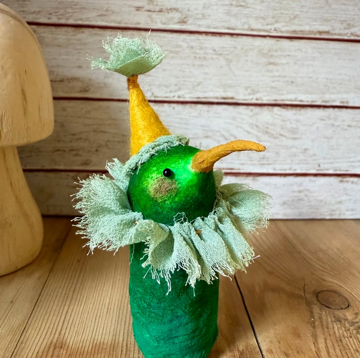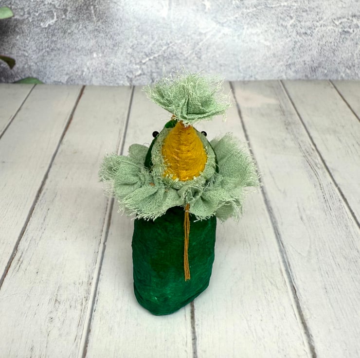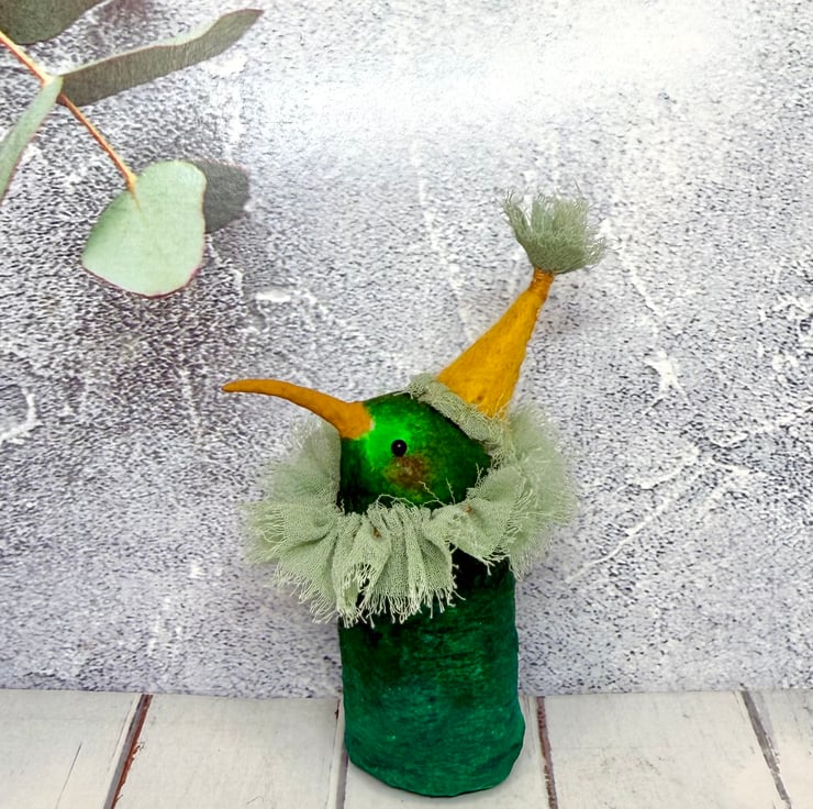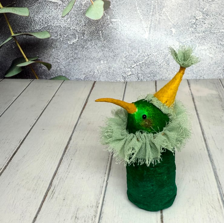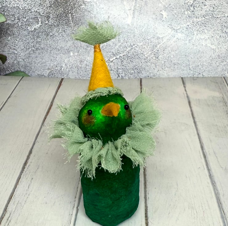 One of a kind miniature art doll made using spun cotton with glass bead eyes. Doll is hand painted in various greens with yellow beak. Bird wears chiffon ruffle and hand sewn felt hat with chiffon Pom Pom on top. Bird measures roughly 8.5cm tall and can stand unaided on a flat surface. This delicate item is for decorative purposes only and not a toy. Sent in recycled or recyclable packaging.