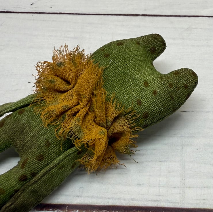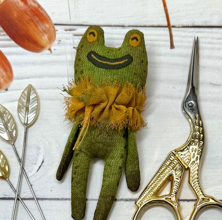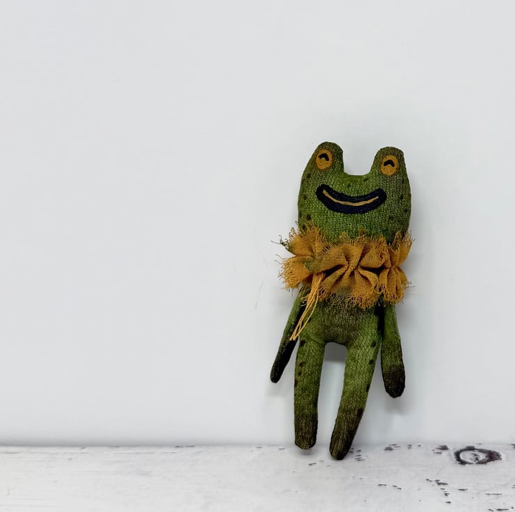 This one of a kind little frog is a stuffed cotton doll entirely hand painted with speckles. Frog wears hand painted chiffon ruffle around the neck. Frog measures roughly 7.5cm tall and comes in recycled or recyclable packaging. This is for decorative purposes only and not a toy. If you’d like a hanger please choose from the option.