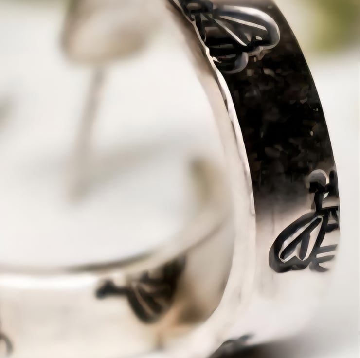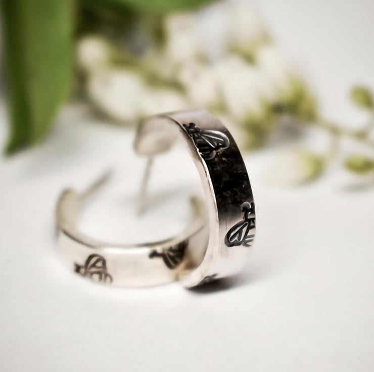 Lovely handmade, bee stamped half hoop earrings, 100% recycled sterling silver.